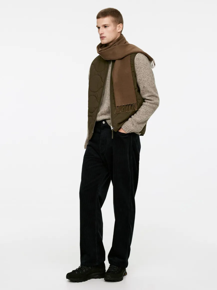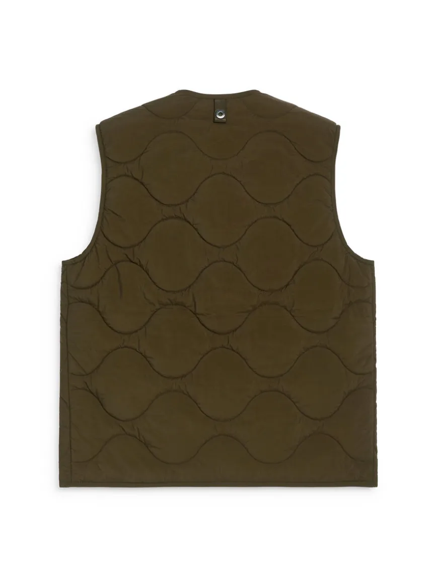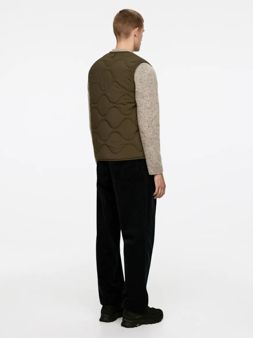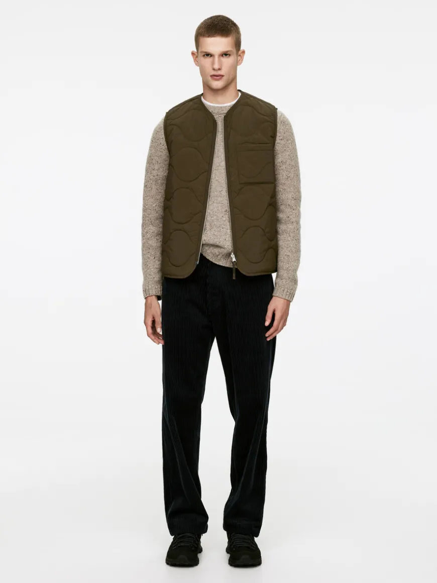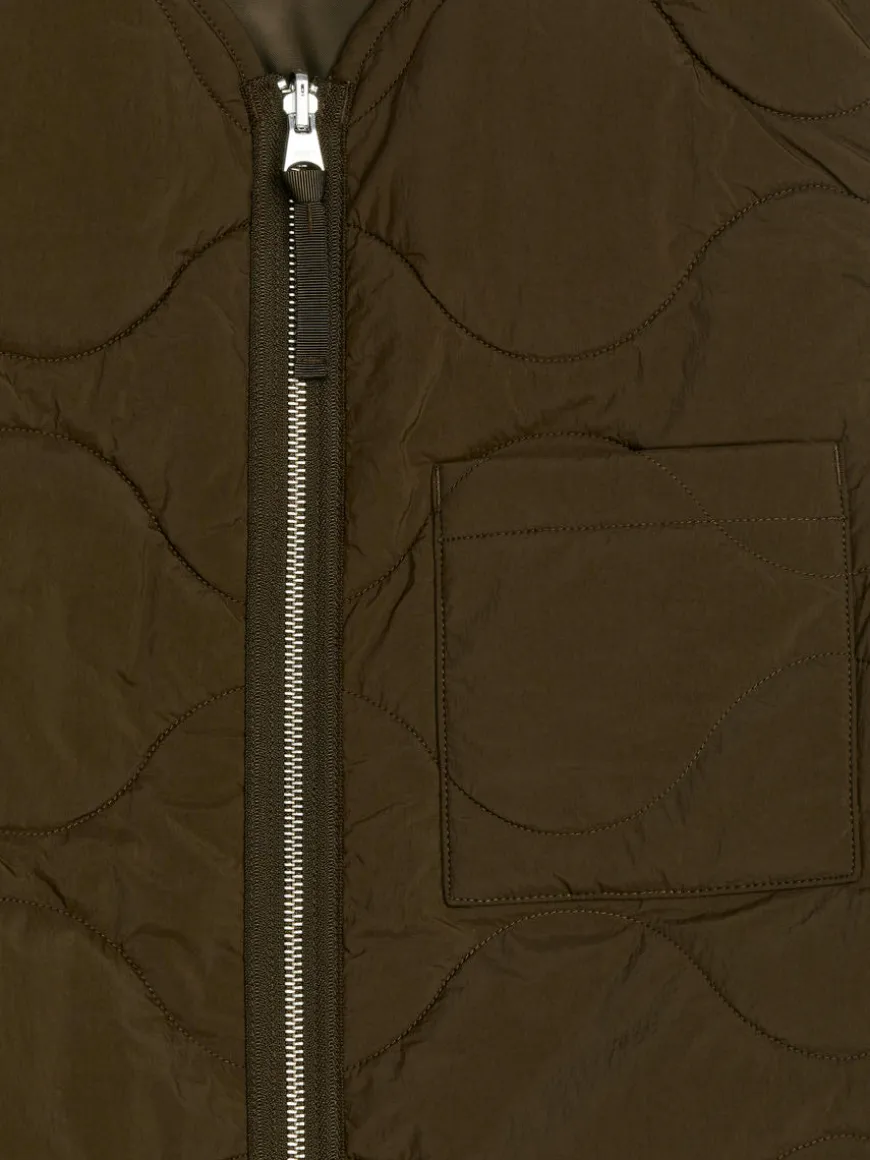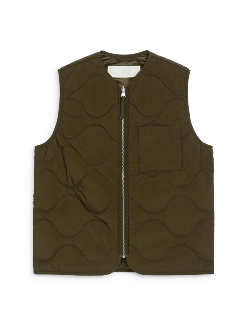 Compact padded vest with ARKET’s signature onion quilting. The shell fabric is a rip stop construction and the padding offers lightweight insulation. The vest is detailed with a front zip, a patch pocket at left-hand side and an inner patch pocket. Windproof material and water-repellent finish. This garment is part of the 2-in-1 Series, a modular outerwear system that includes shells and insulating liners specifically designed to be snapped together, forming a fully padded coat.