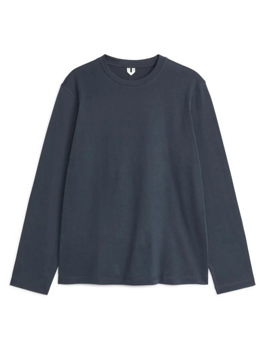 Long-sleeved T-shirt made from a lightweight jersey fabric in a blend of cotton and polyester. Styled with a loose fit.