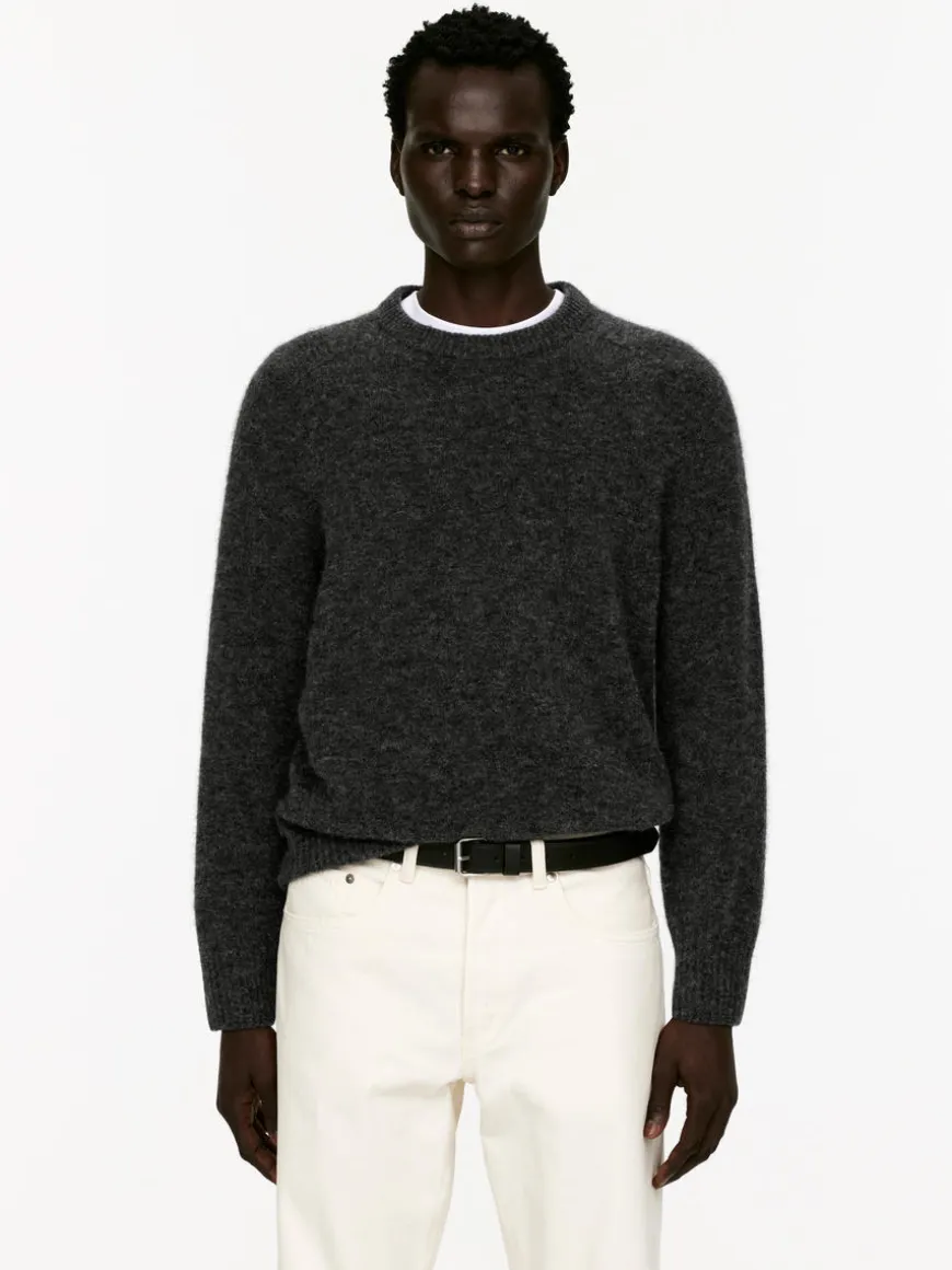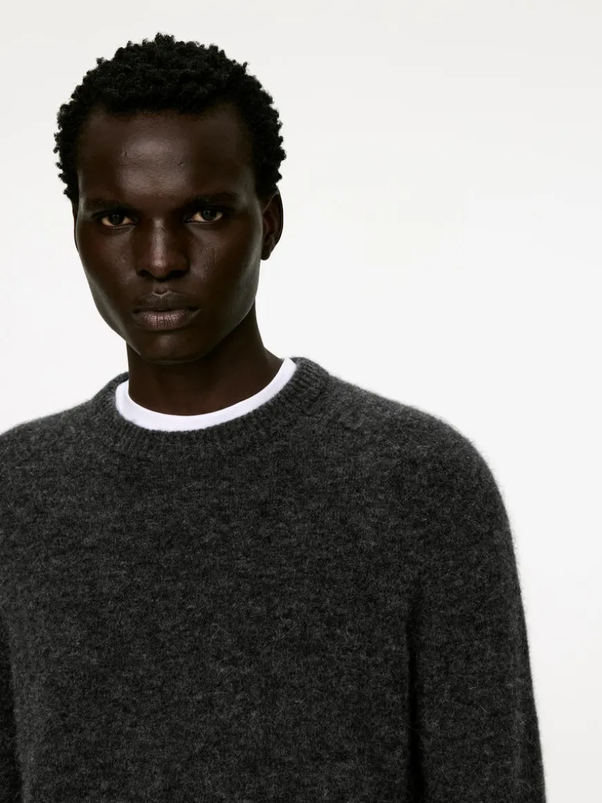 Chunky crew-neck jumper with a cosy, hairy surface. Polyester and elastane have been added to the yarn for lightweight and durability properties.