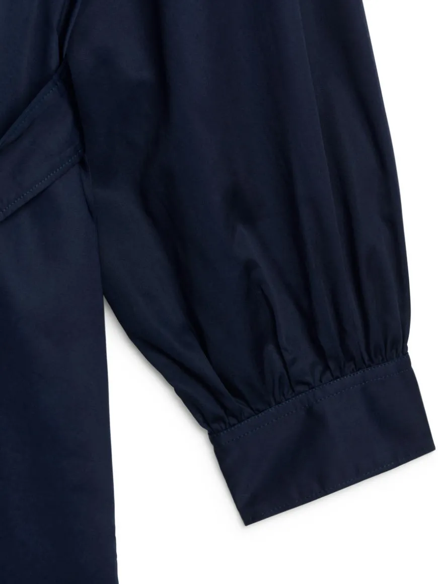 Mid-length shirt dress with standing collar, volume sleeves and waist belt. Gathers at back of neck and dropped shoulders. Side pockets.