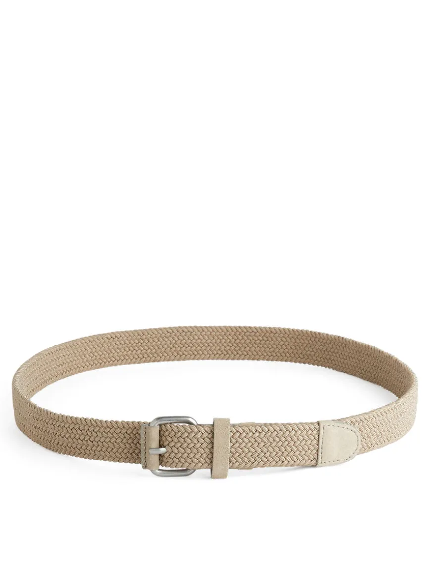 Braided belt made from elasticated cords. Trimmed with leather details. Width 3 cm.