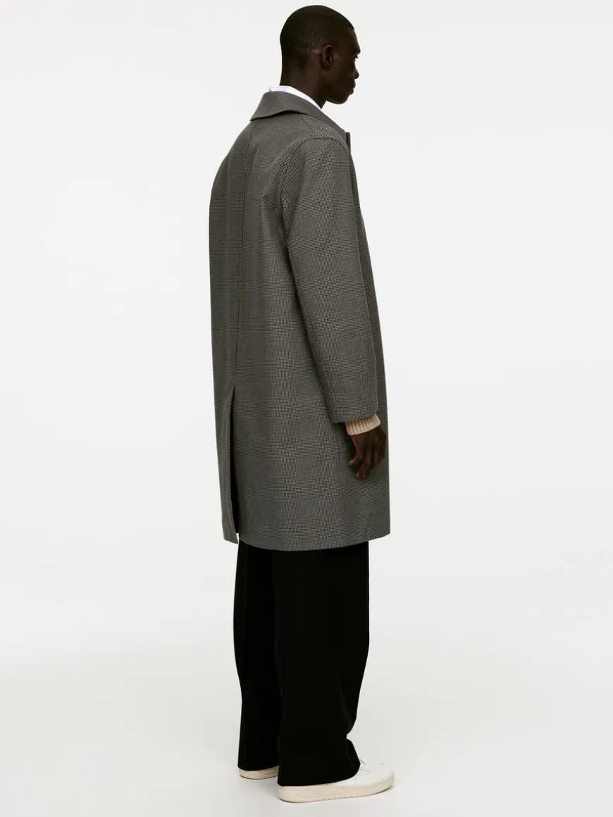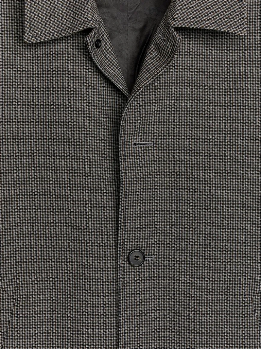 Car coat featuring a pattern of mini checks. A knee-length style cut for a regular fit with slightly dropped shoulders. Styled with a regular collar, front buttoning and slanted pockets. Two jetted inner pockets. Slit at the back. Fully lined.