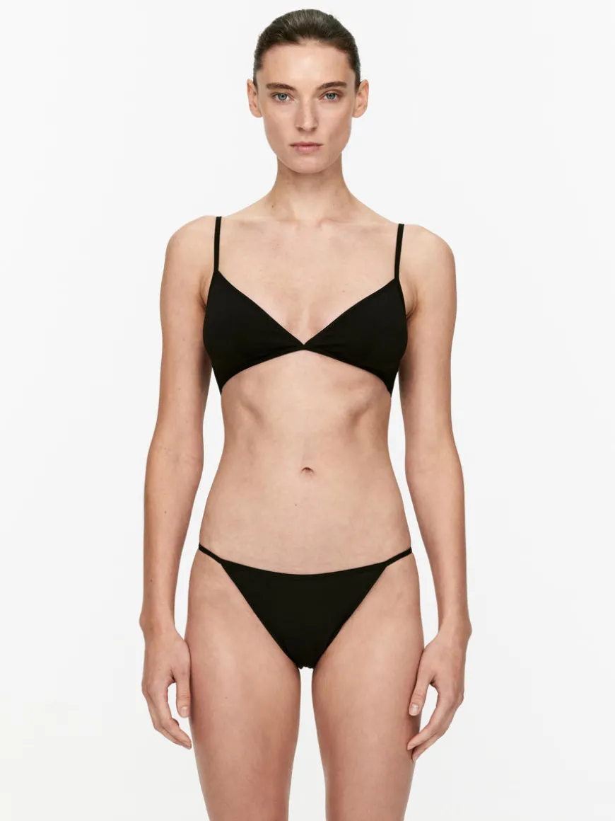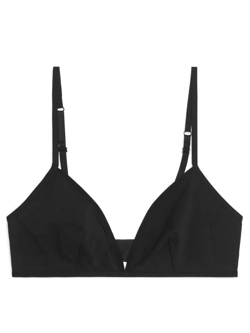 Soft cotton bra featuring a triangle design with elastic bindings and adjustable, thin straps.