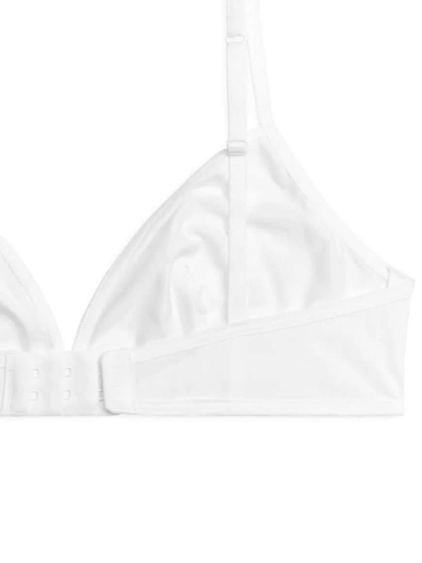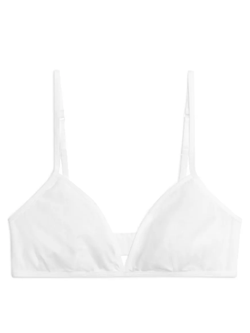 Soft cotton bra featuring a triangle design with elastic bindings and adjustable, thin straps.