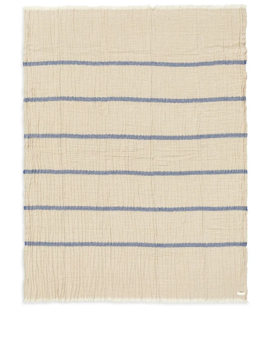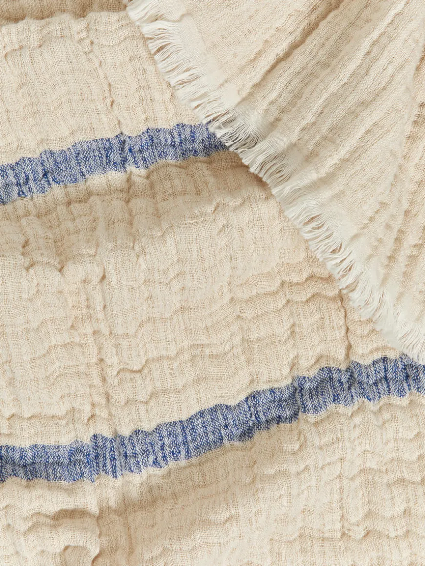 Crinkled blanket made from a lightweight double weave of linen and cotton. Detailed with fringed edges. Dimensions 130 cm x 170 cm.