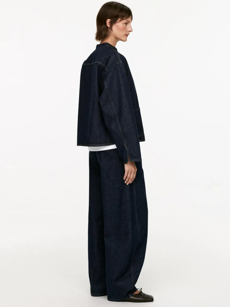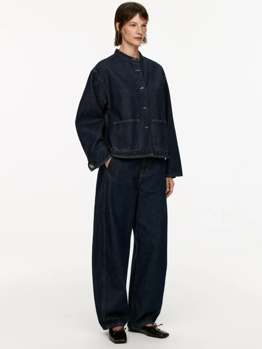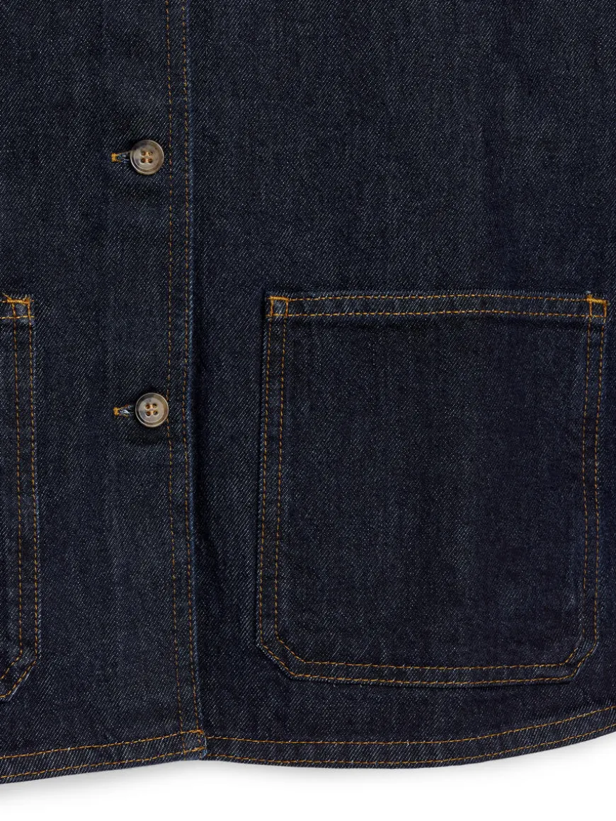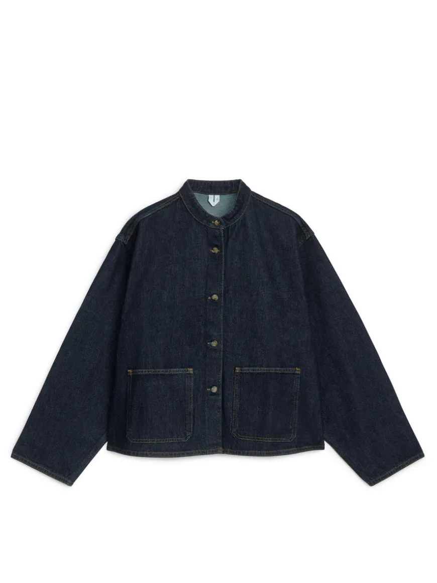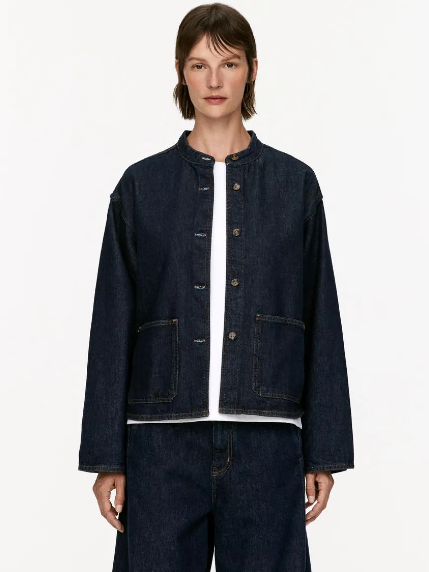 Denim overshirt crafted from cotton. A button-up style with standing collar and pockets at front. Regular fit.