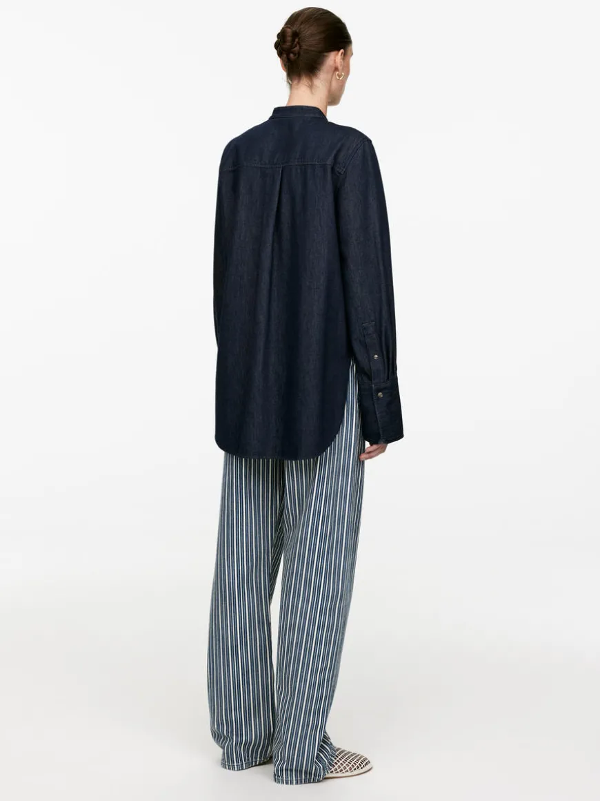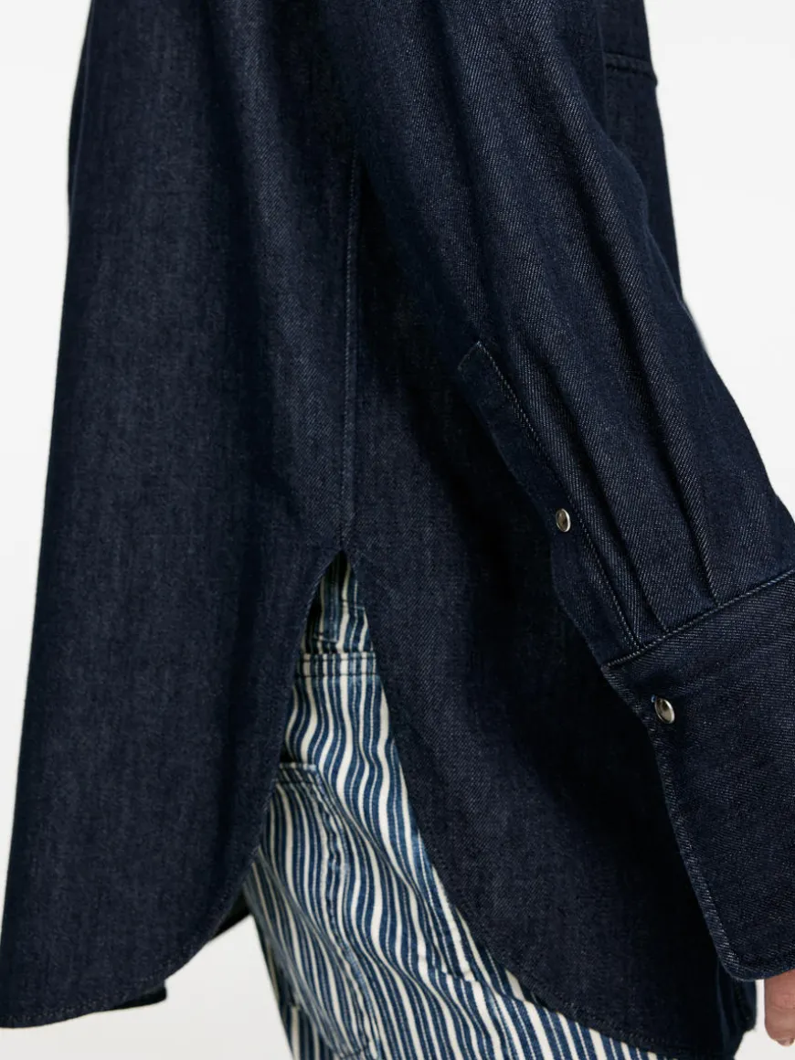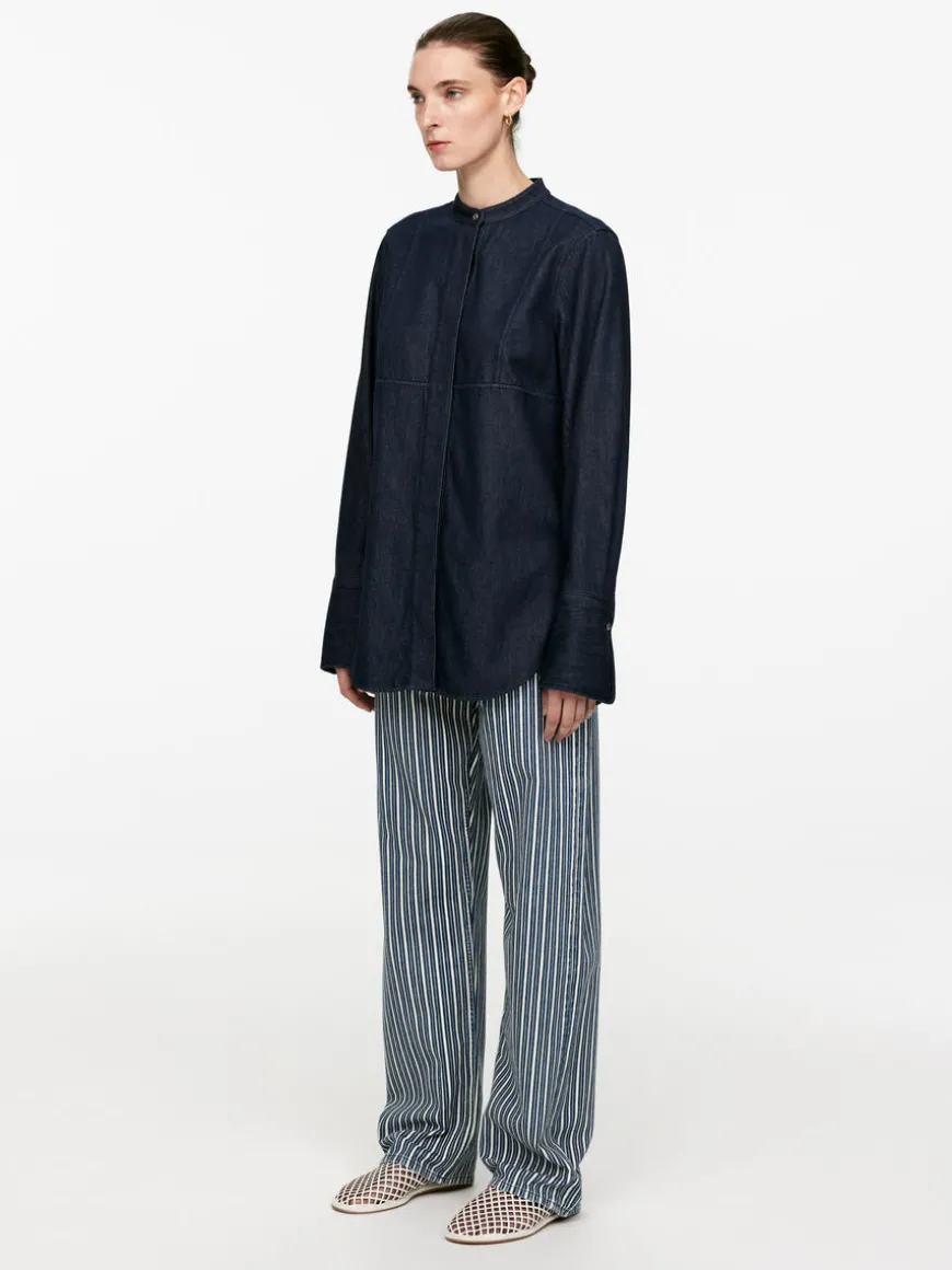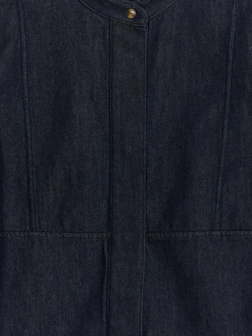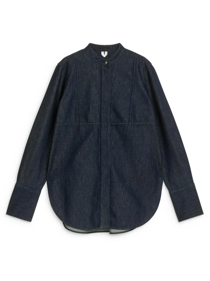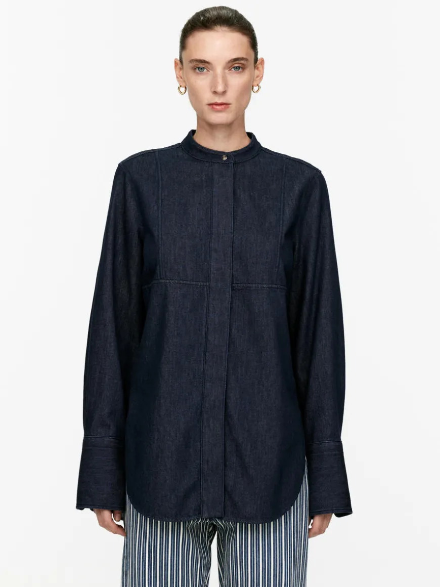 Long-sleeved denim shirt crafted from a cotton blend. Styled with a standing collar and vertical and horizontal cut-and-sewn detailing at chest. Regular fit.