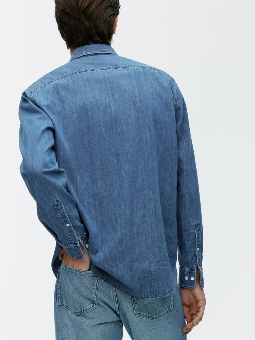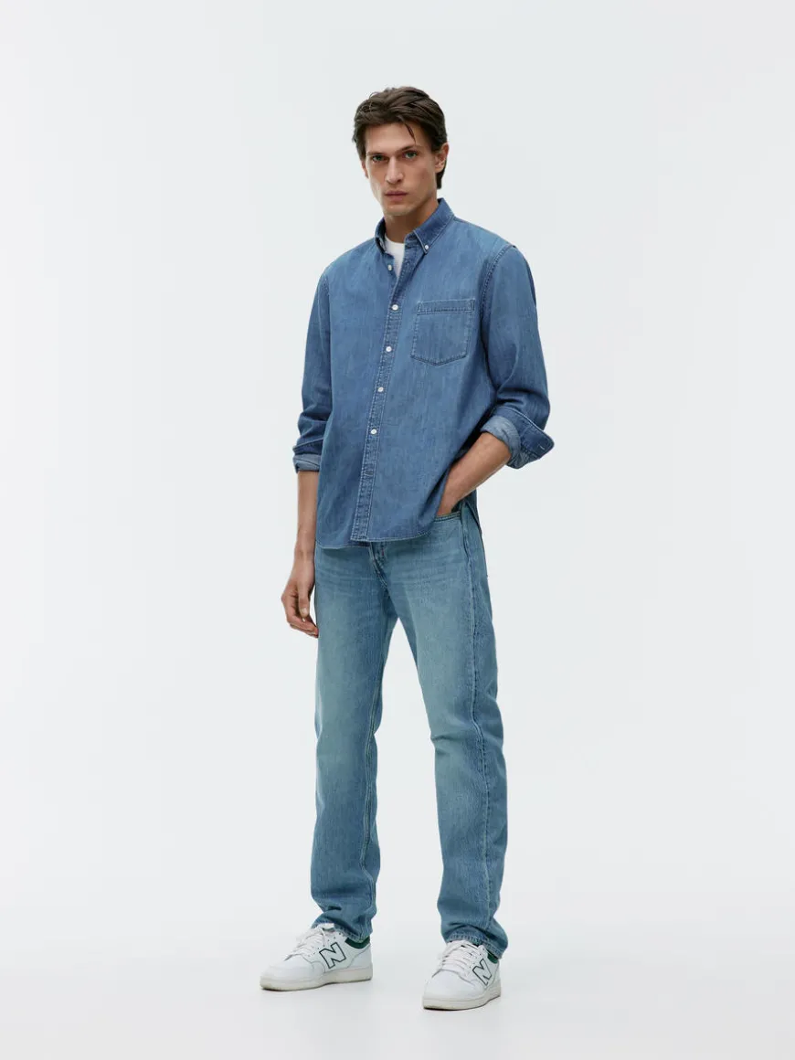 Button-up denim shirt with regular fit. Styled with chest pocket and buttoned cuffs.
