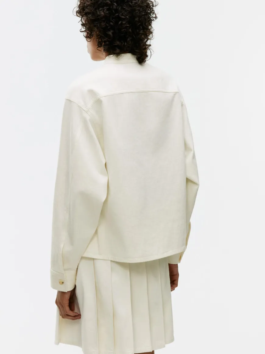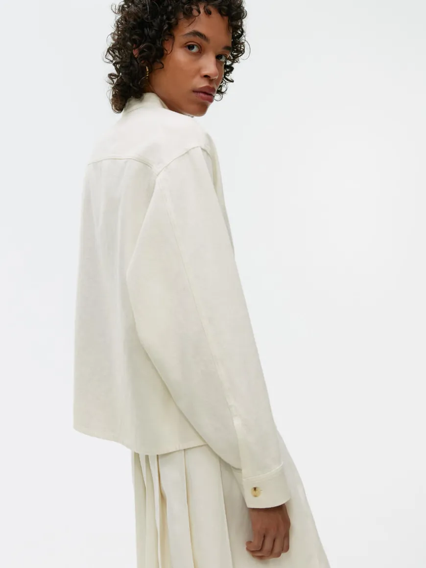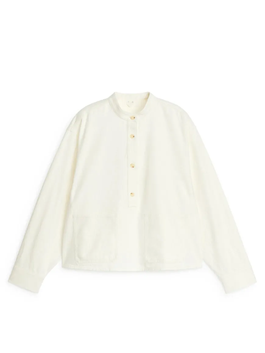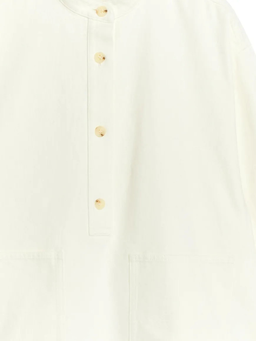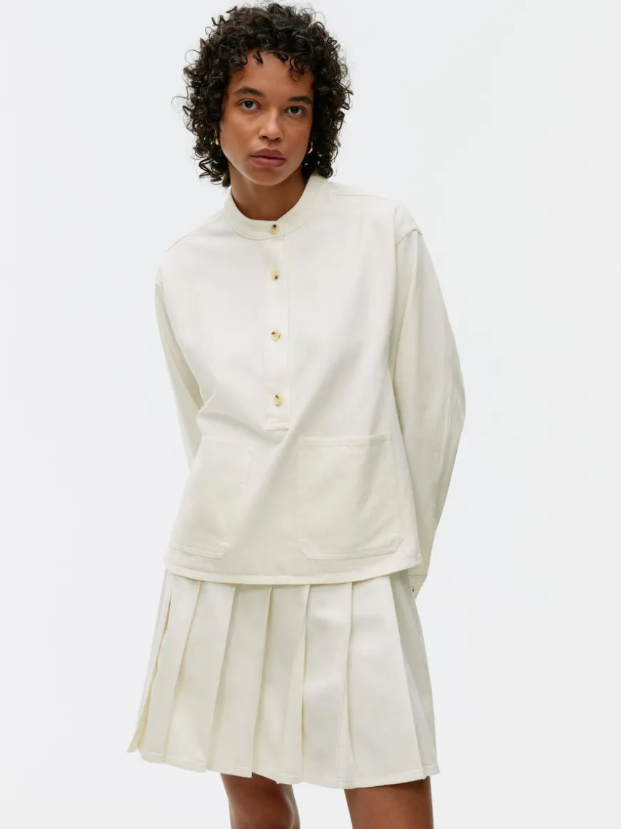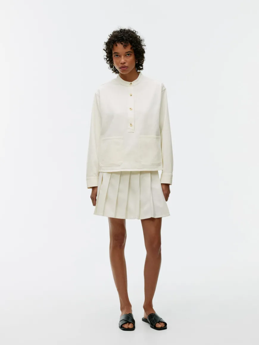 Denim shirt crafted from cotton. Styled with a standing collar, two front pockets and buttoned cuffs. Regular fit.