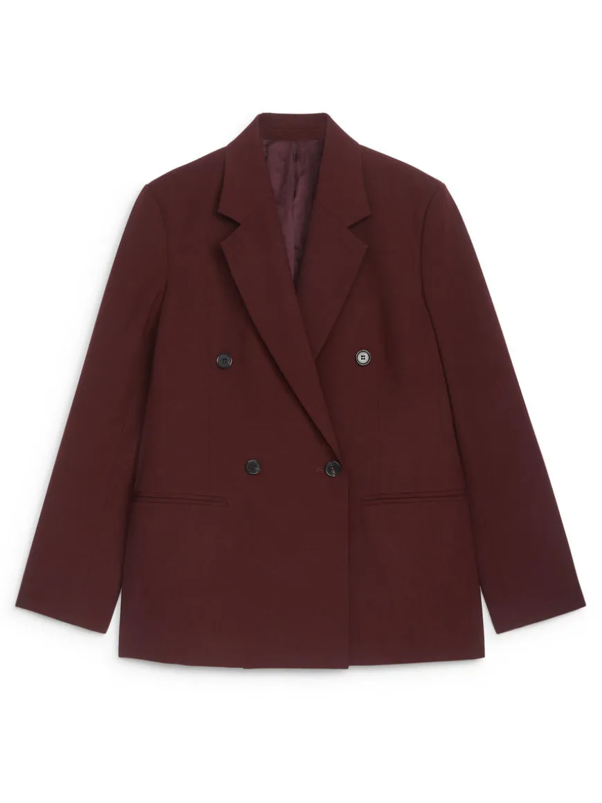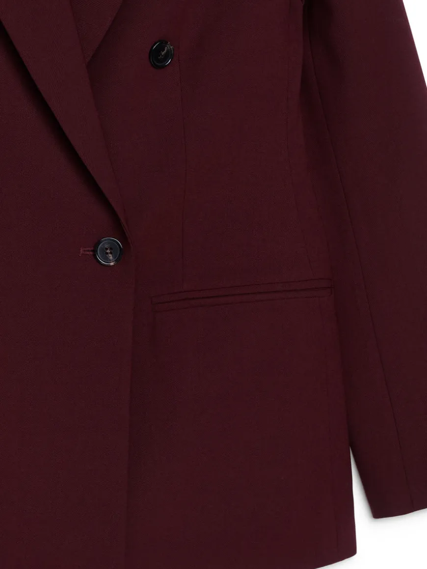 Double-breasted blazer with welt pockets at front. Relaxed fit. Fully lined. The shell fabric contains 43% RWS wool (TE-00047206). Products certified to the Responsible Wool Standard (RWS) contain wool fiber from farms independently certified to animal welfare and land management requirements.