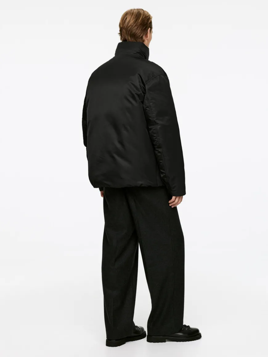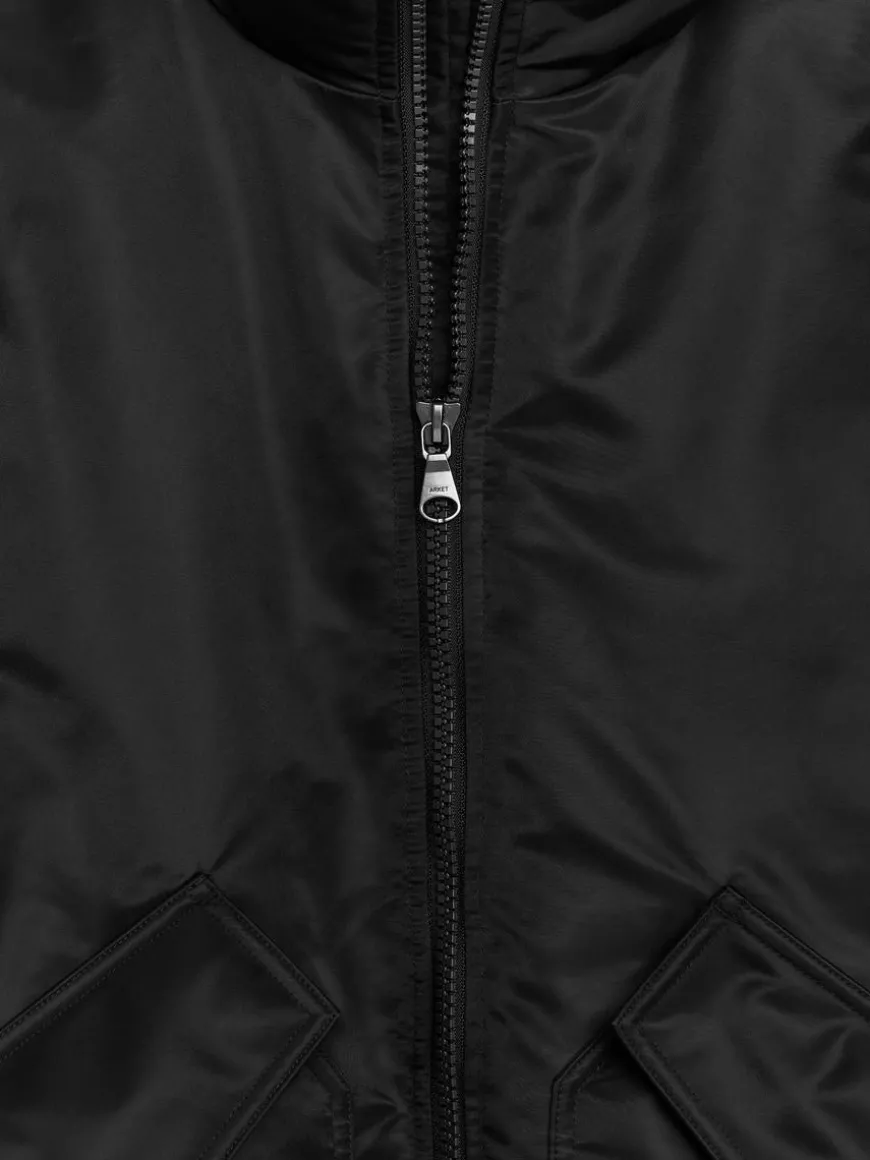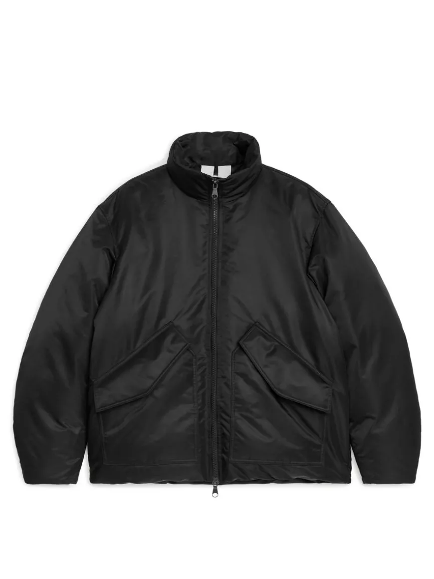 Flight jacket filled with a blend of down and feathers for cold resistance. A nylon twill shell provides wind resistance and water repellent properties. Styled with a high collar and a two-way zip at front. Two large pockets with flaps and snap button closure. Snap buttons at end of sleeves to enable adjustments of the sleeve width. Elastics at inside hemline for heat retention. Inner pocket with zip closure.