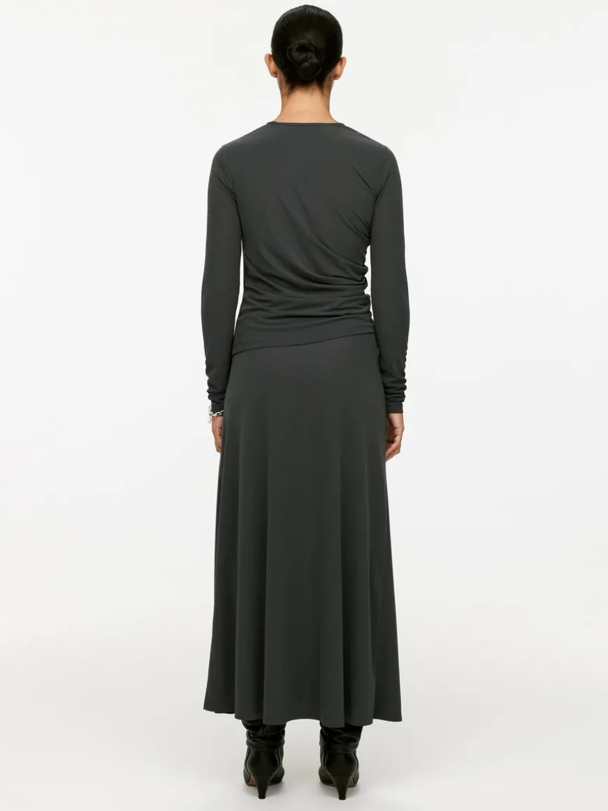 Long-sleeved jersey top with draping at body and an asymmetrical bottom hem. Slim fit.