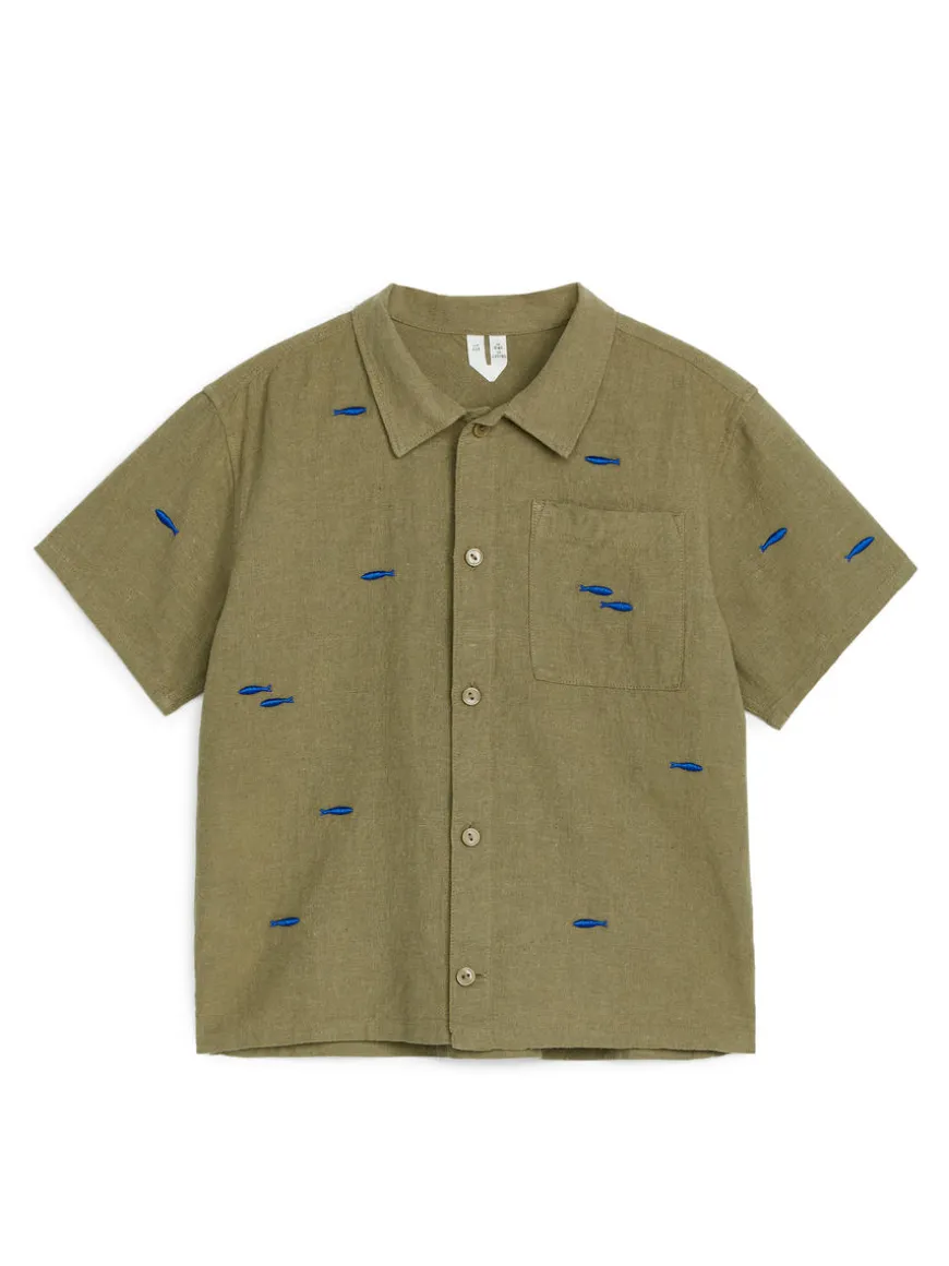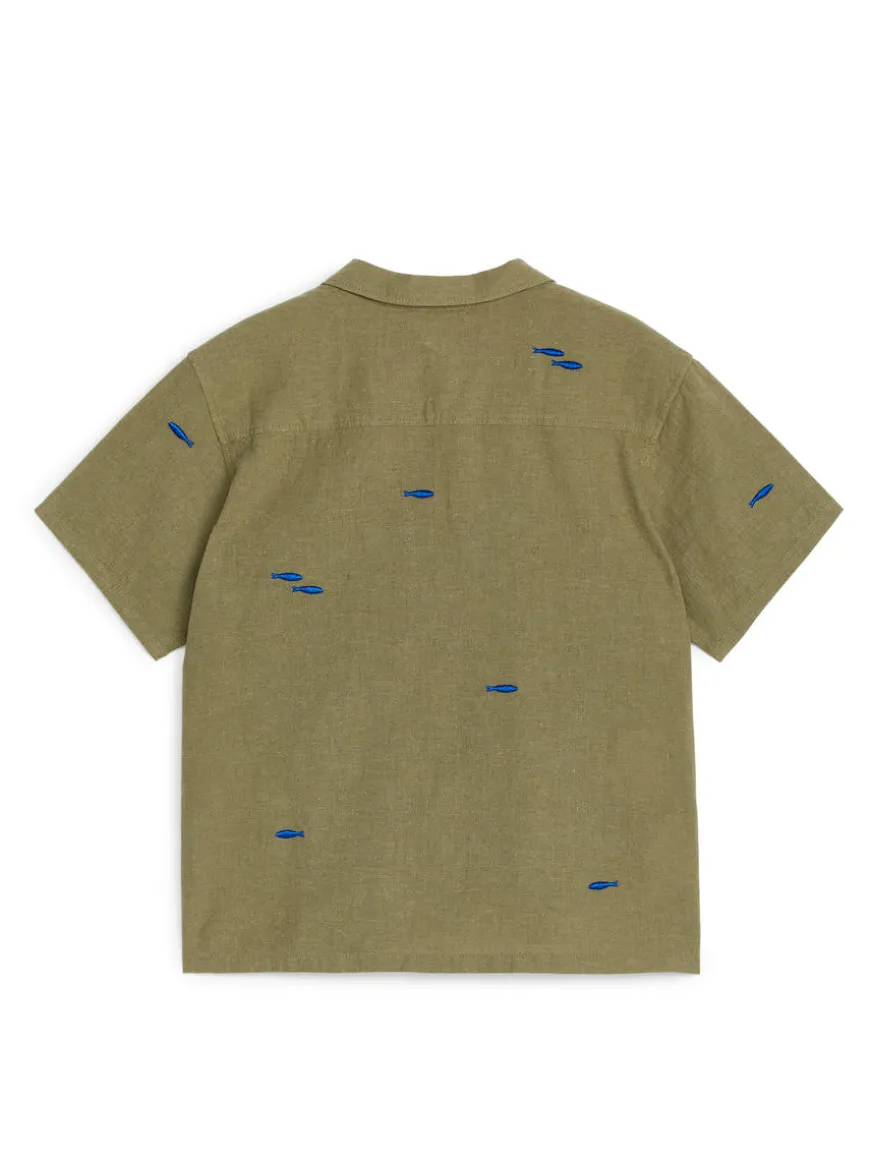 Short-sleeved linen-cotton shirt with embroidered detailing. Styled with a front patch pocket and side slits. Regular fit. Part of set.