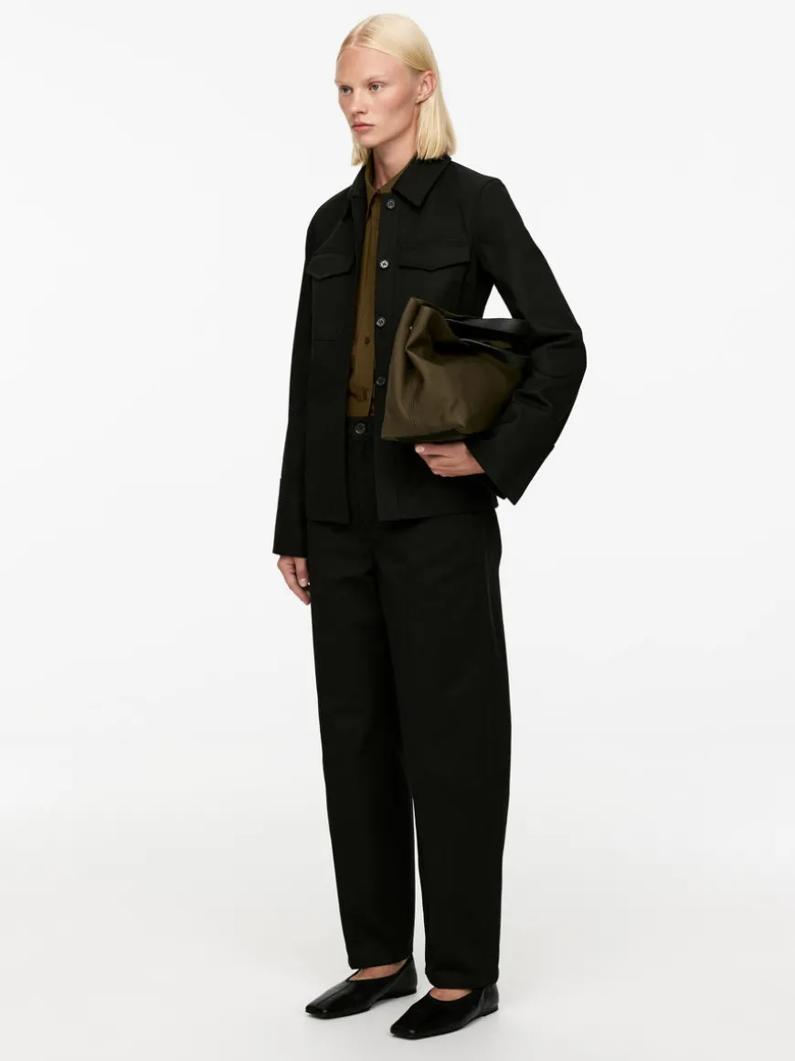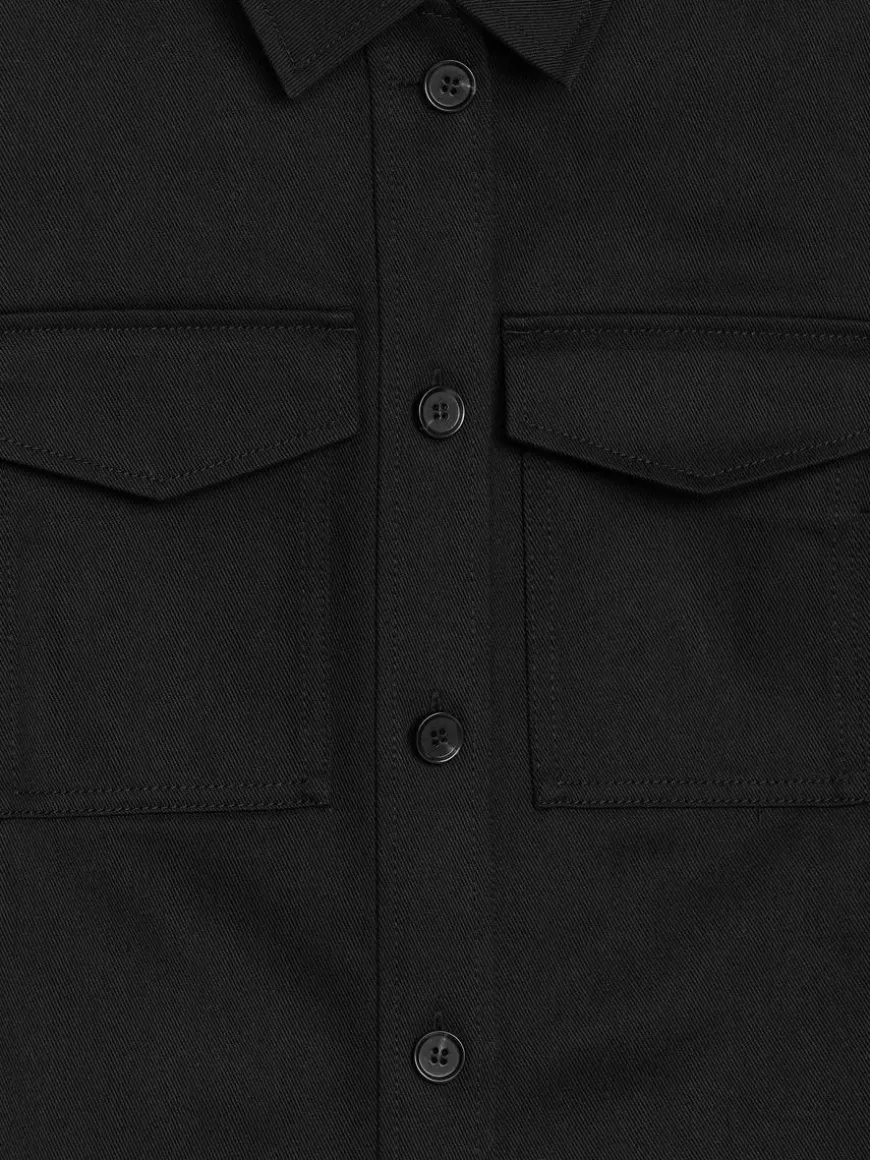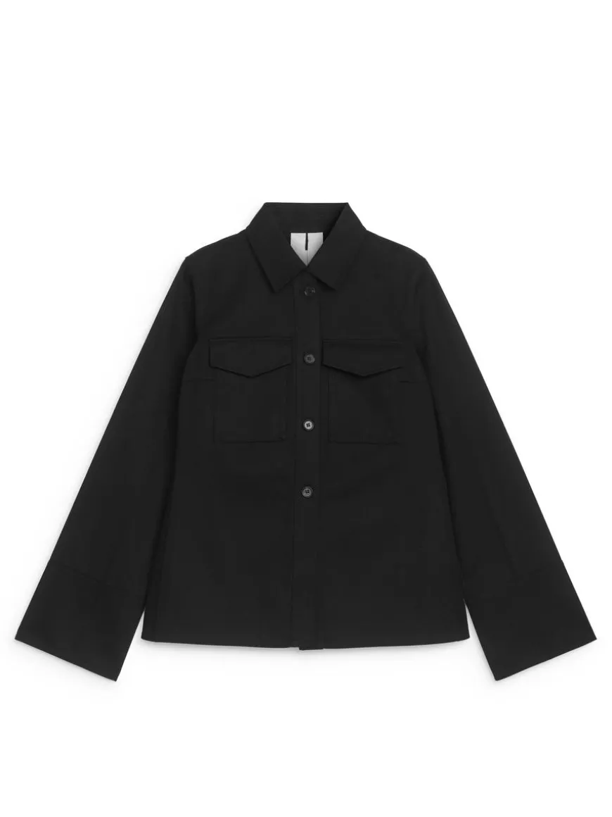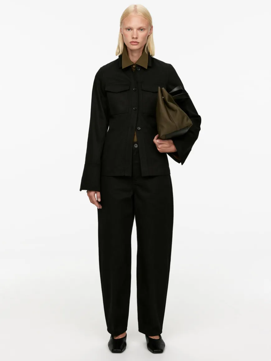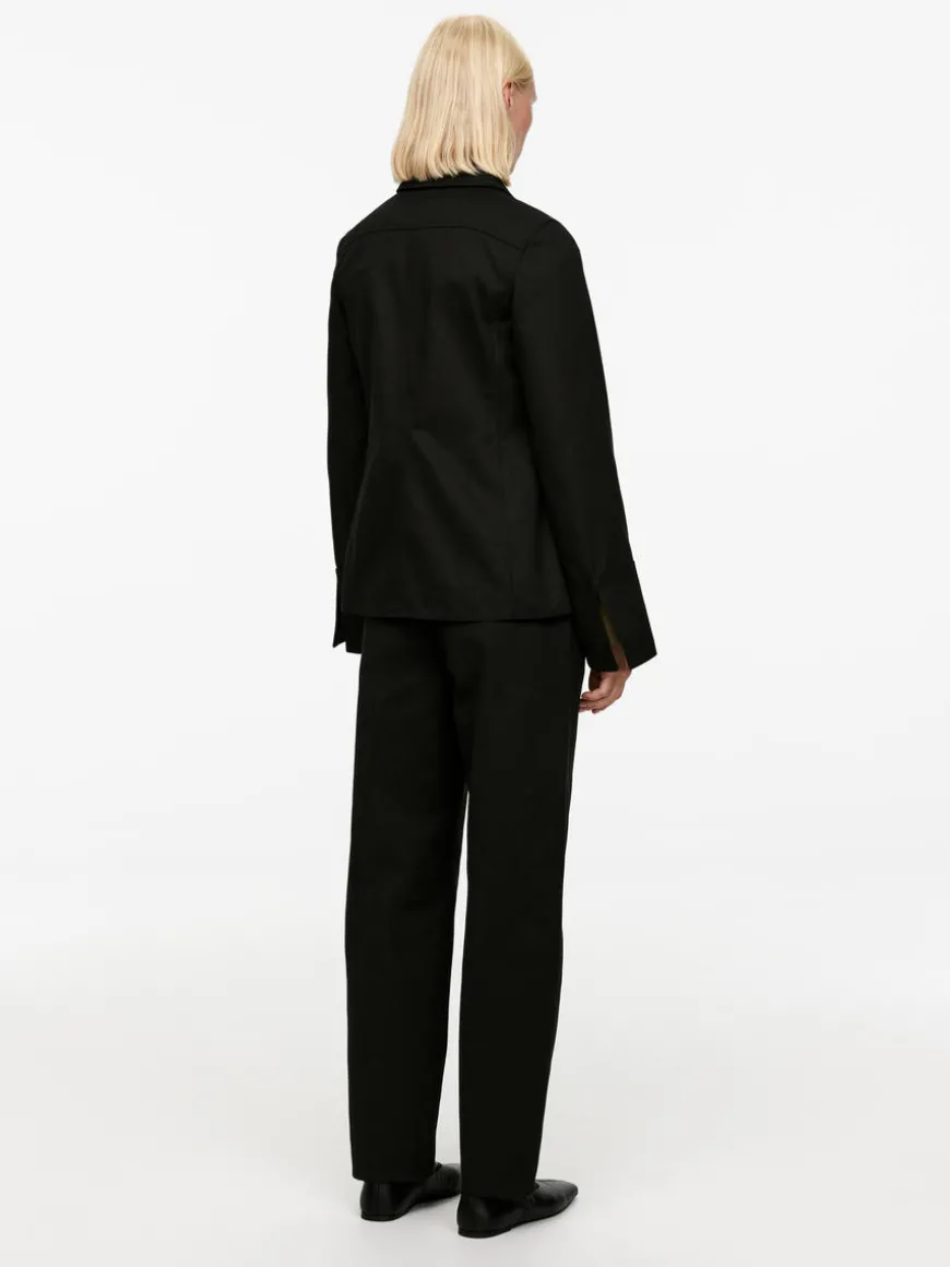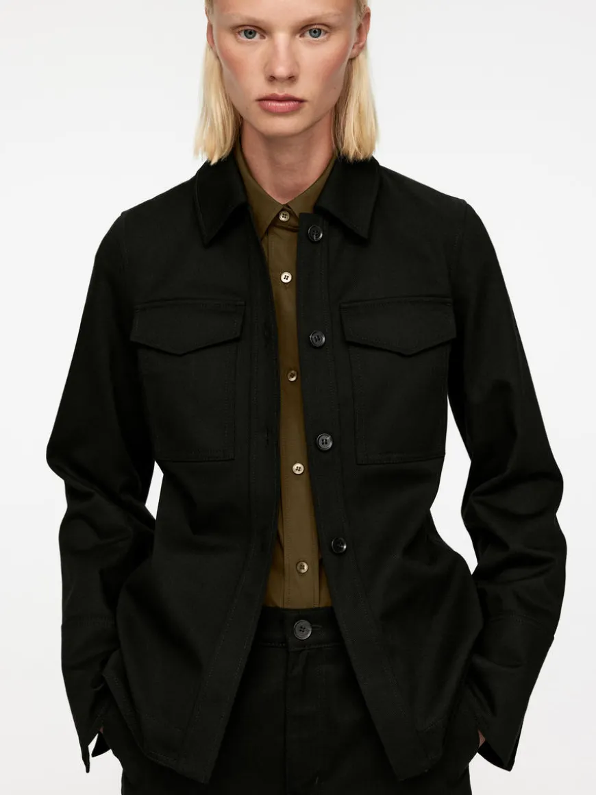 Fitted denim jacket with button closure and flap pockets at chest. Cuffs with slit at back.