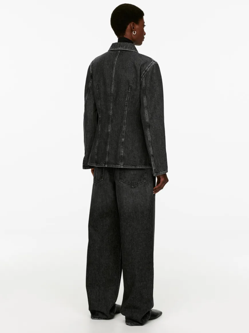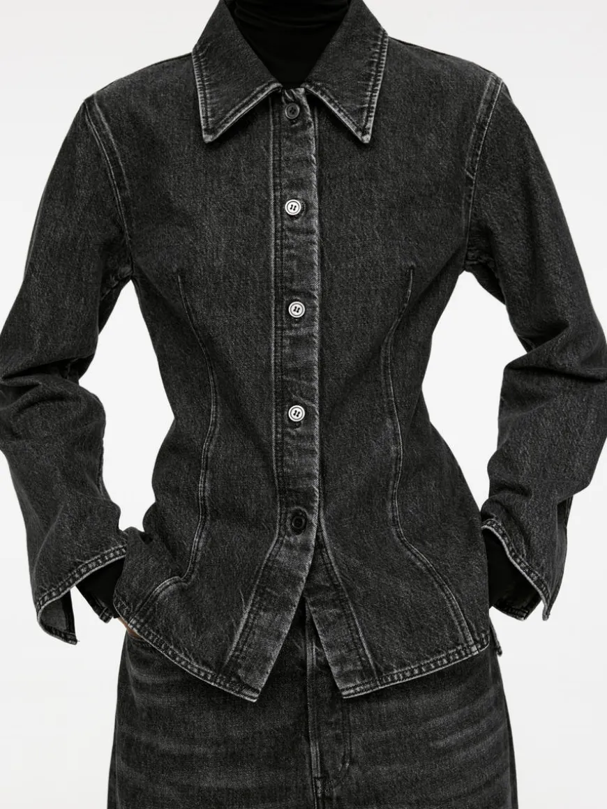 Cotton denim shirt with fitted waist and slit at side seams and end of sleeves. Slim fit.