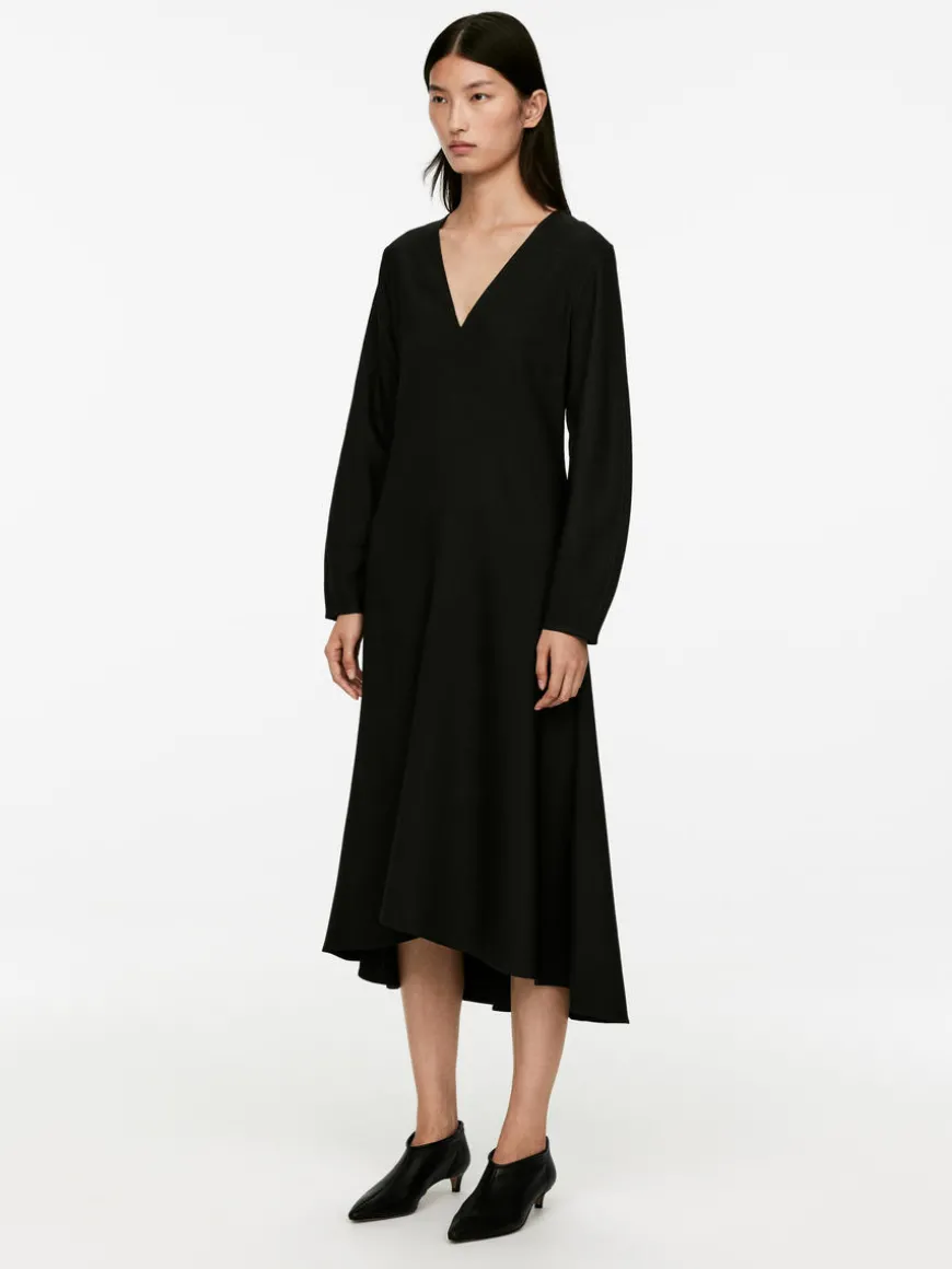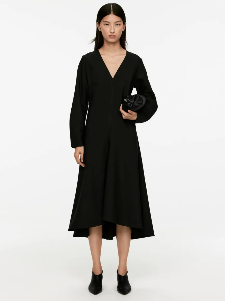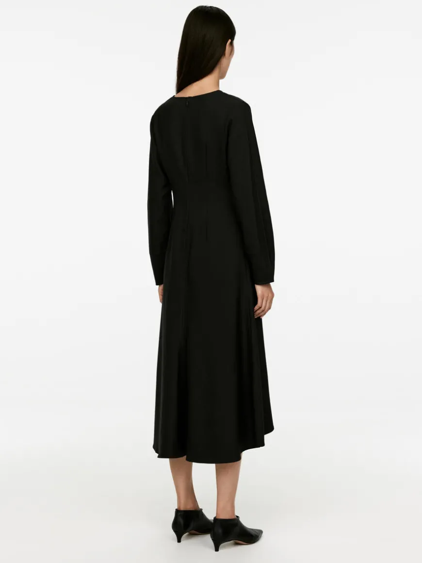 Mid-length dress with a flared silhouette crafted from a wool-blend. Detailed with darts near cuffs to create a slightly rounded sleeve shape and darts at bust. Cut seams at centre front and back. Concealed zip at centre back. The dress contains 53% RWS wool (TE-00047206). Products certified to the Responsible Wool Standard (RWS) contain wool fiber from farms independently certified to animal welfare and land management requirements.