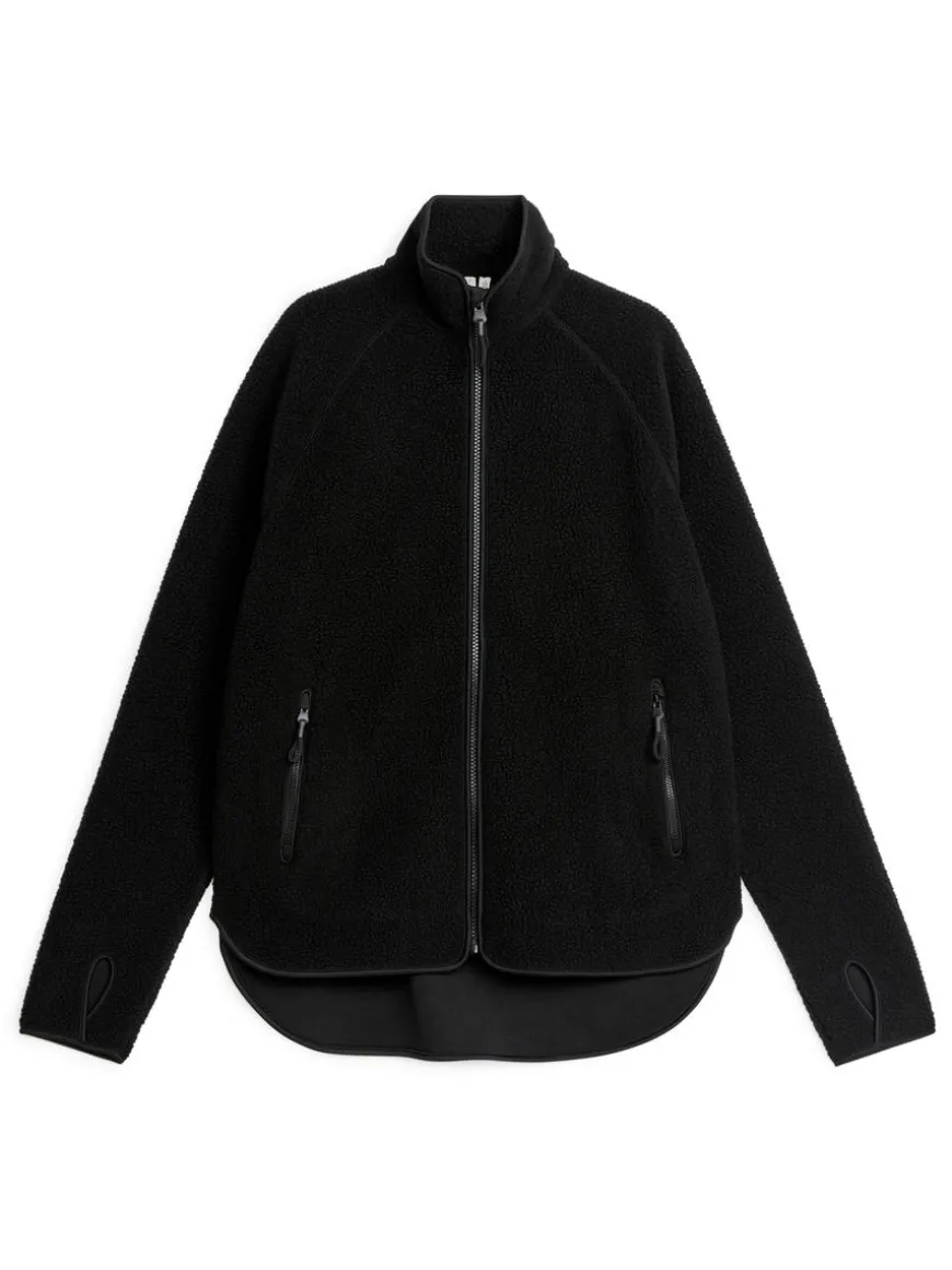 Jacket crafted from a warming fleece fabric. Cut for a regular fit and slightly longer at back. The jacket features a high collar with front zip and raglan-cut sleeves with thumbholes.