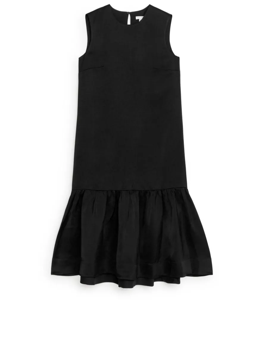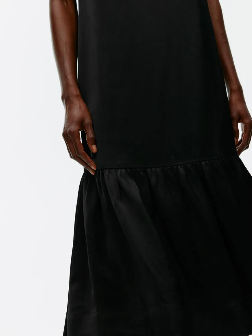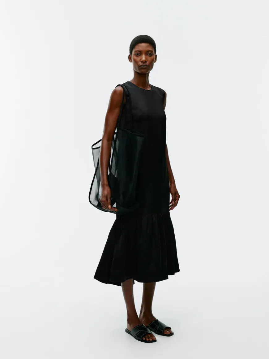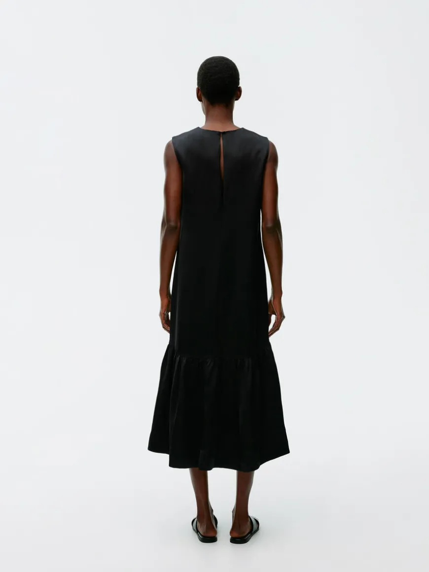 Sleeveless midi dress with a straight silhouette and a flounced skirt. Designed with a rigid fabric with a semi-shine finish. The bottom hem is shorter in the front and slightly longer in the back. Slit opening with button-and-loop closure at centre back.