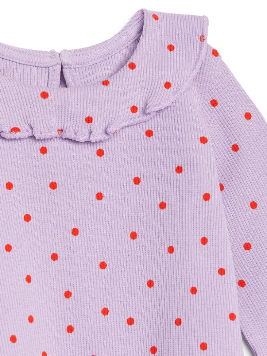 Long-sleeve bodysuit crafted from stretchy rib jersey. Adorned with a frill collar. Snap buttons at crotch for easy dressing and changing.
