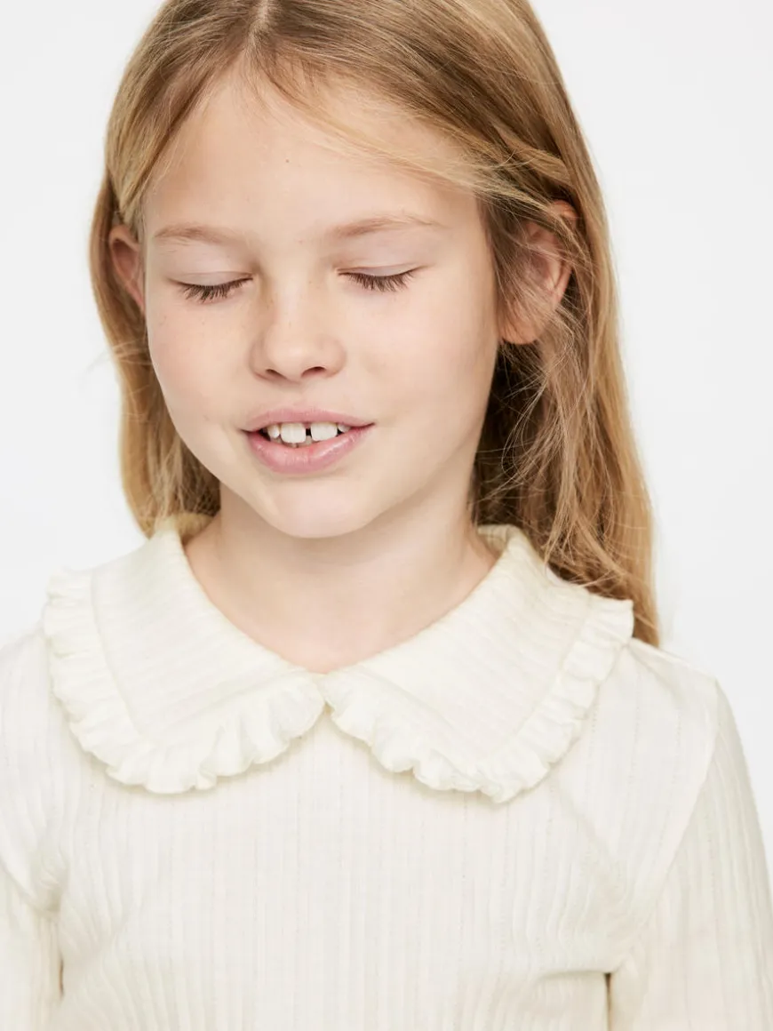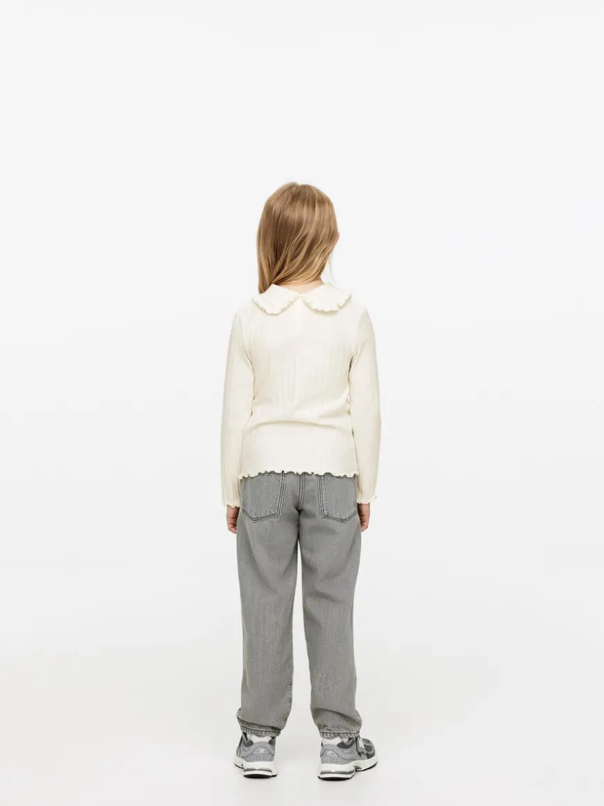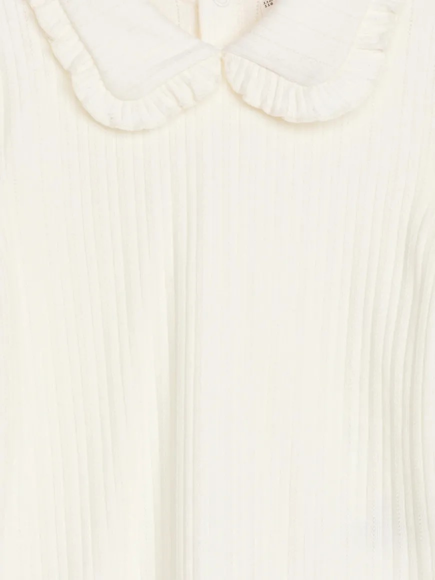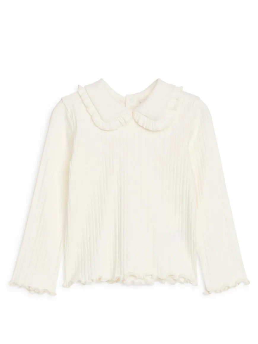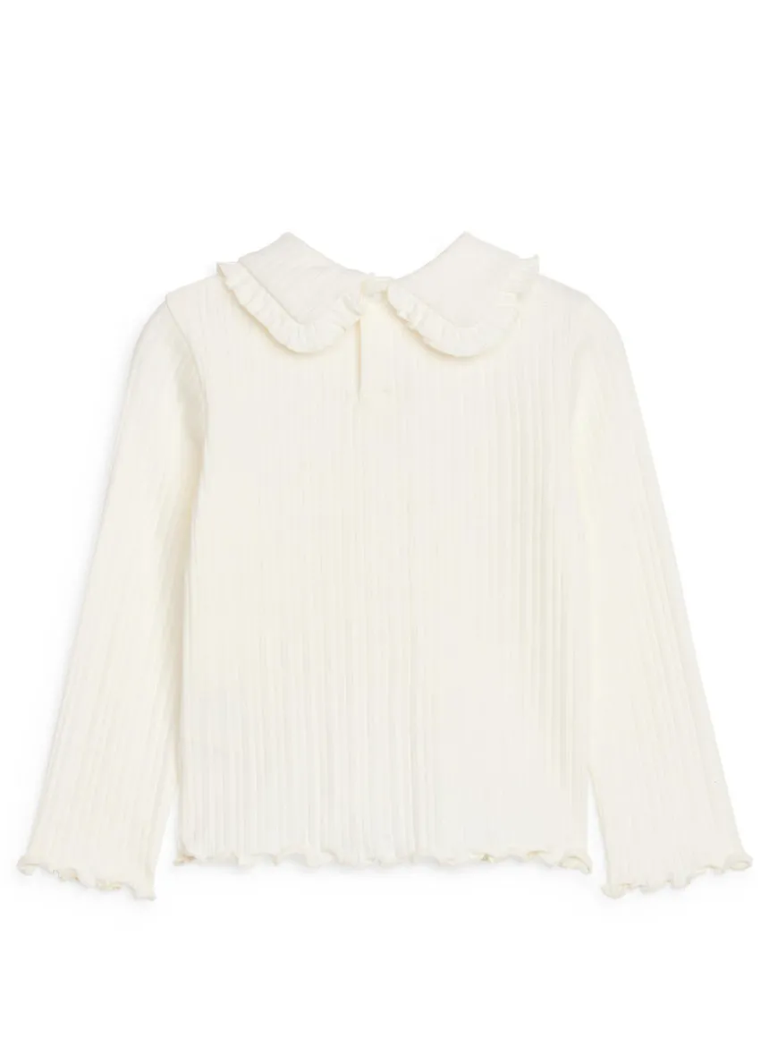 Long-sleeved top cut from pointelle jersey made of cotton. Styled with frill collar, babylock edges and button closure at centre back.
