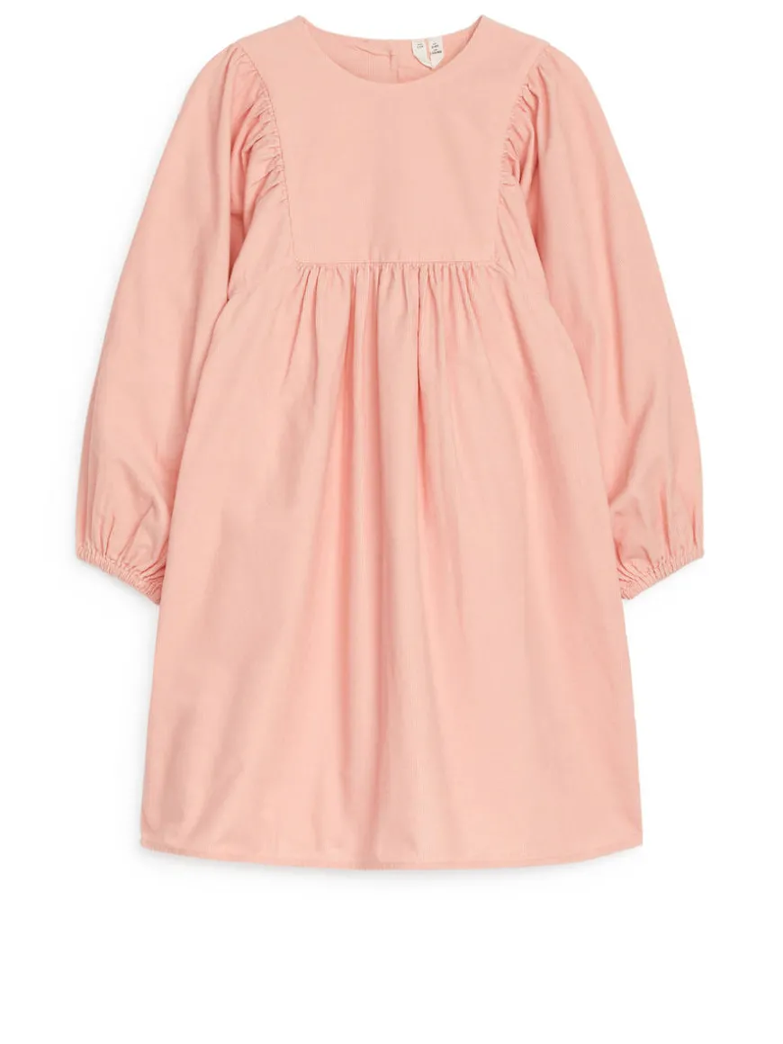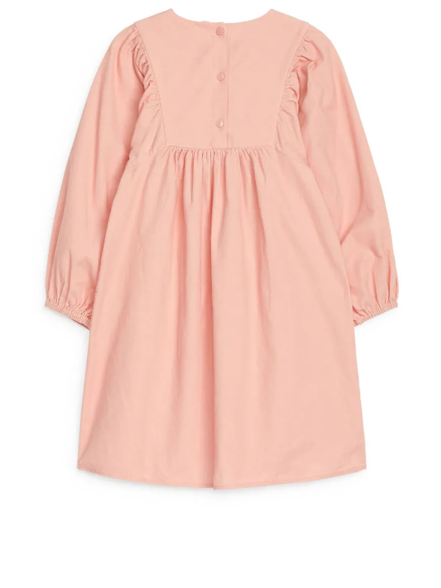 Long-sleeved cotton dress with gathers and button closure at back. Elastics at sleeve edges.