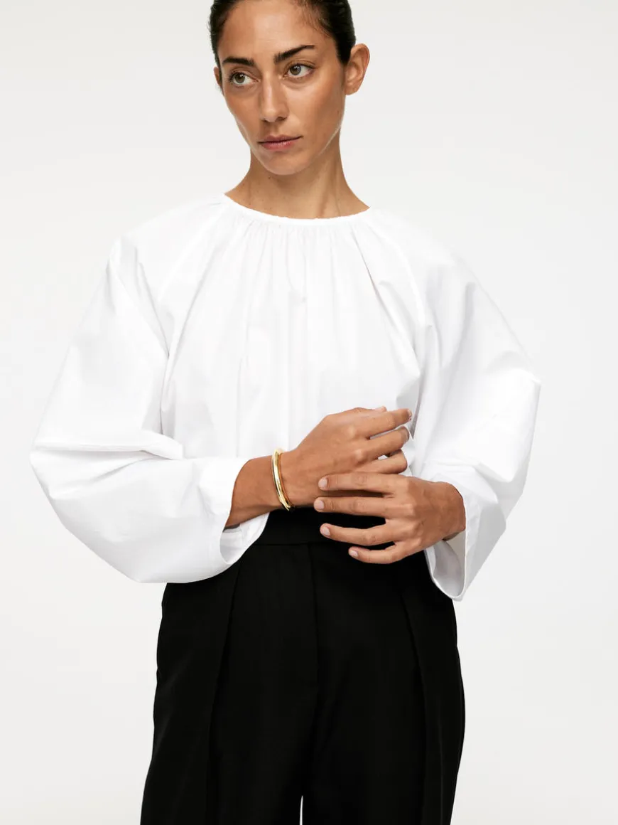 Chunky bangle in gold-plated brass with decorative white enamel line. Magnetic closure. Thickness 9 mm.