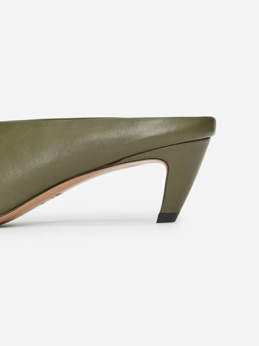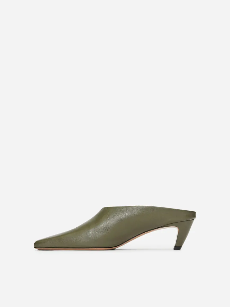 Heeled mules crafted from chrome-free leather. Featuers a low kitten heel, a covered, square-shaped toe. Heel height 5 cm.