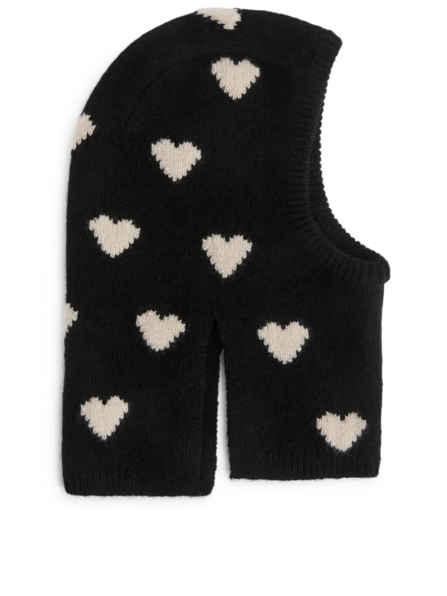 Warming wool hood featuring an intarsia knitted pattern and ribbed edges. Split seams to grant a comfortable fit at both front and back. The product contains 100% RWS wool (TE-00047206). Products certified to the Responsible Wool Standard (RWS) contain wool fiber from farms independently certified to animal welfare and land management requirements.