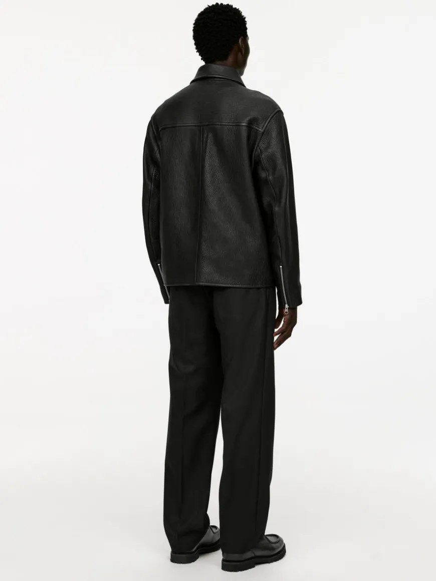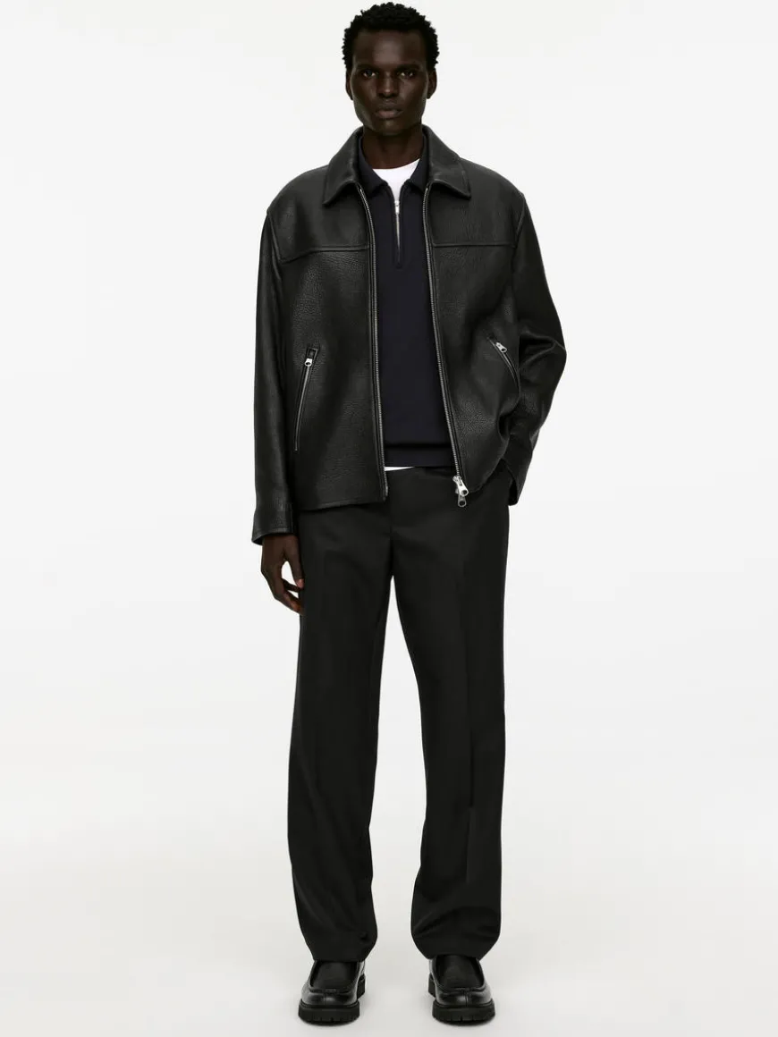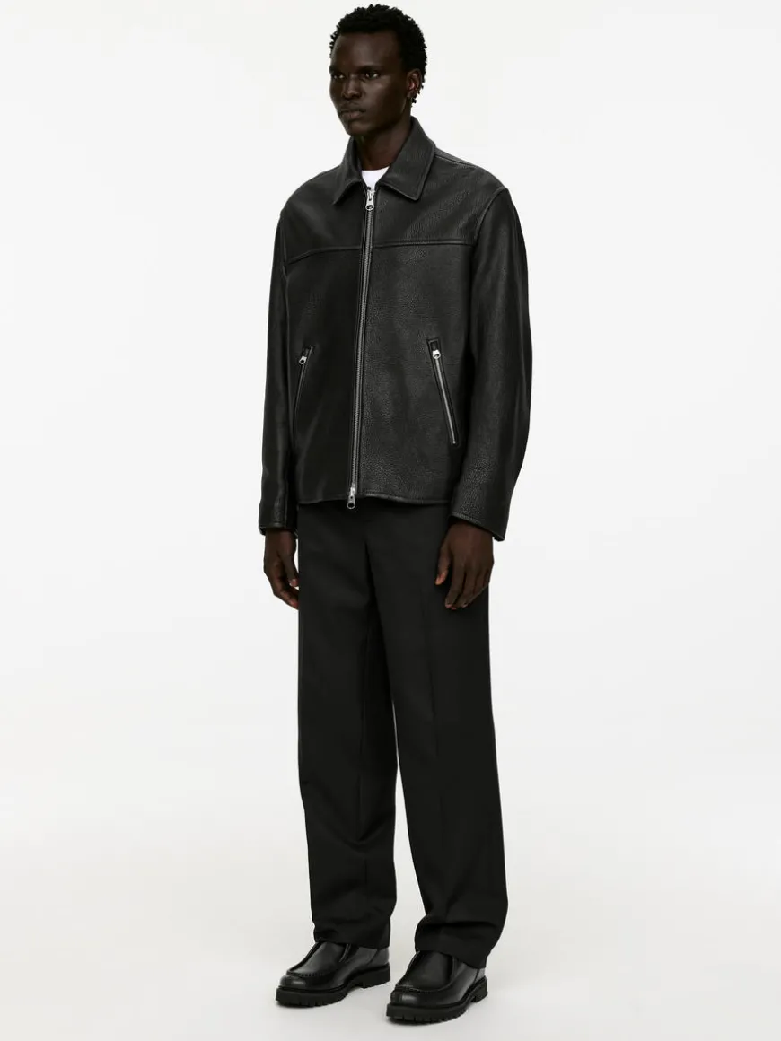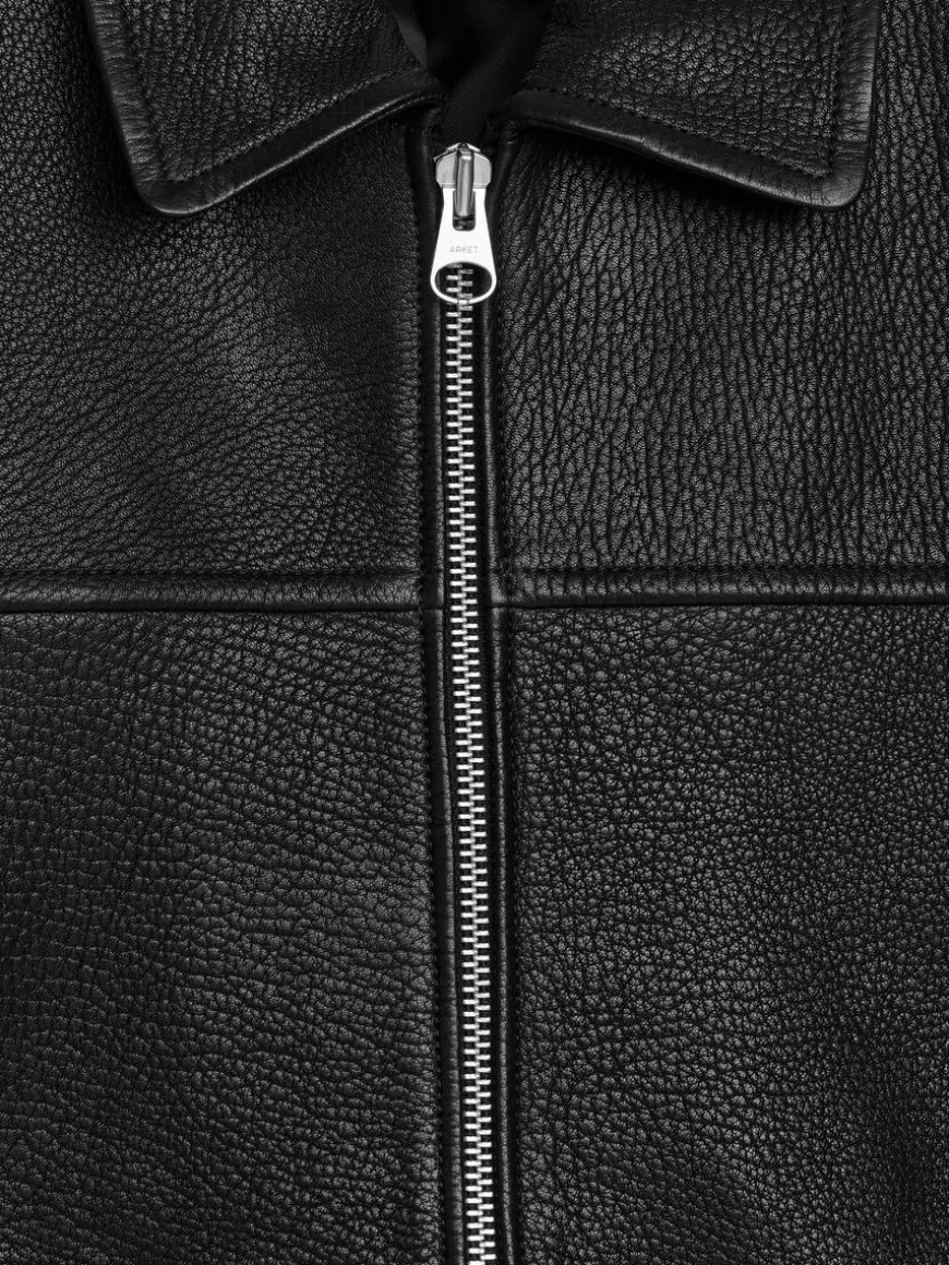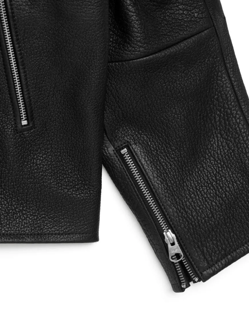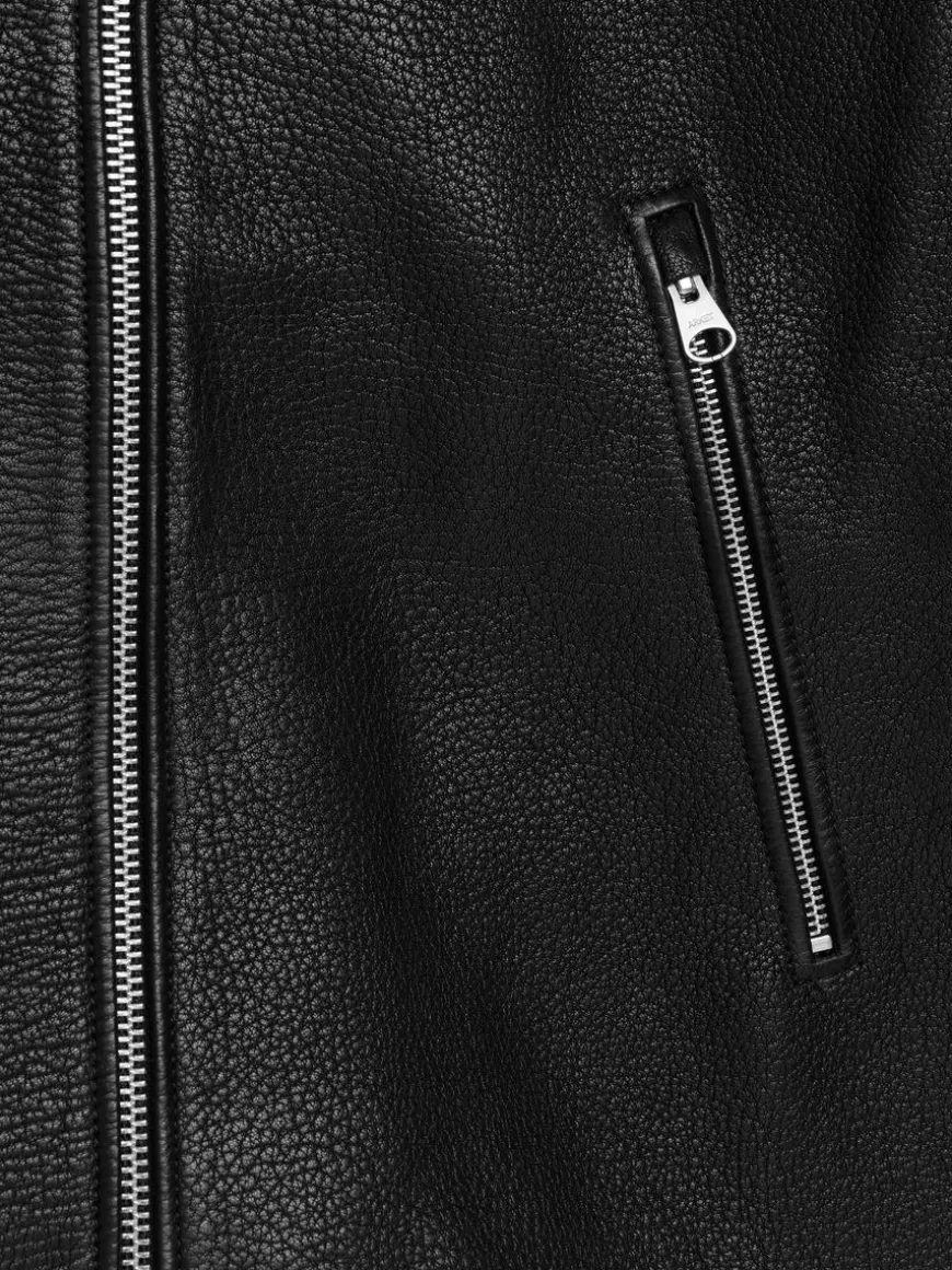 Short leather jacket with zip closure, slanted zip pockets and zip at sleeve endings. Inside welt pocket. Fully lined. Regular fit.