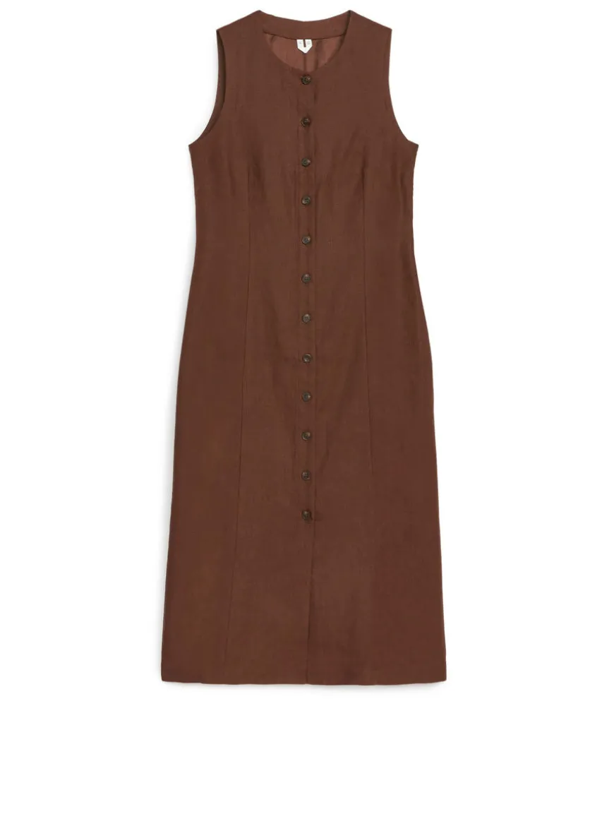Sleeveless dress crafted from linen. A button-up style with a slim fit.