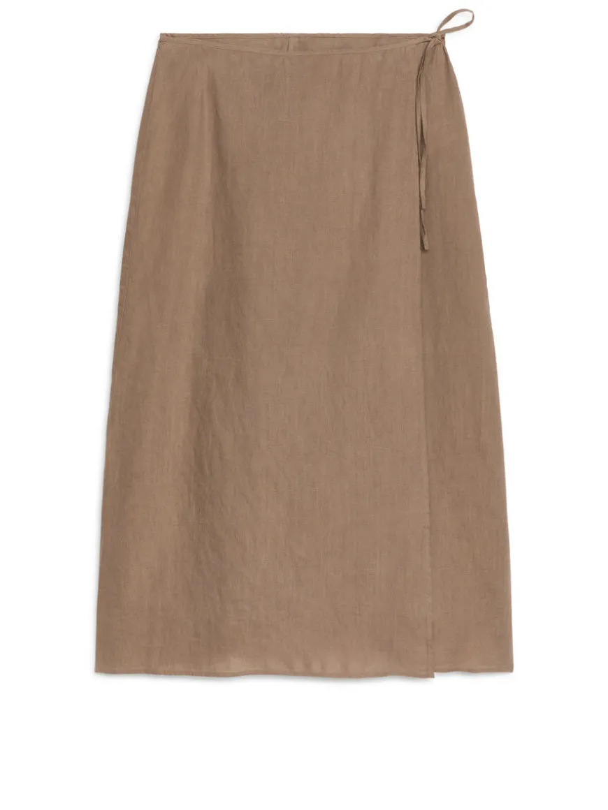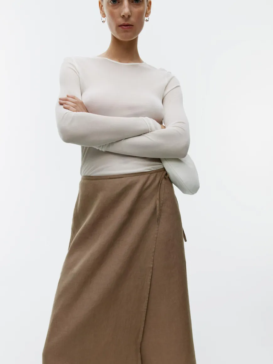 A midi wrap skirt sewn from pure linen. A straight-cut style with a mid-rise waist and tie straps. Unlined.
