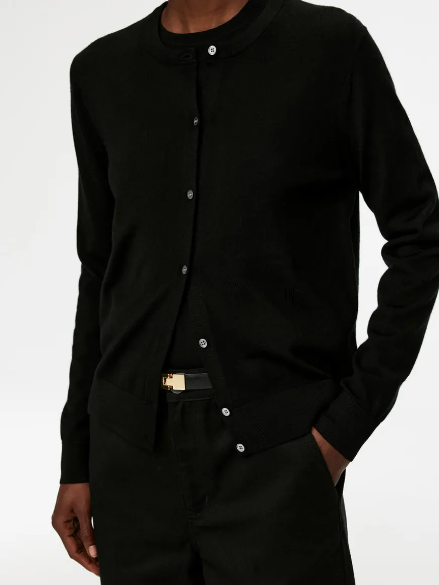 Cardigan knitted from pure merino wool. Styled with ribbed trims and mother of pearl buttons. Regular fit. The cardigan contains 100% RWS wool (TE-00047206). Products certified to the Responsible Wool Standard (RWS) contain wool fiber from farms independently certified to animal welfare and land management requirements.