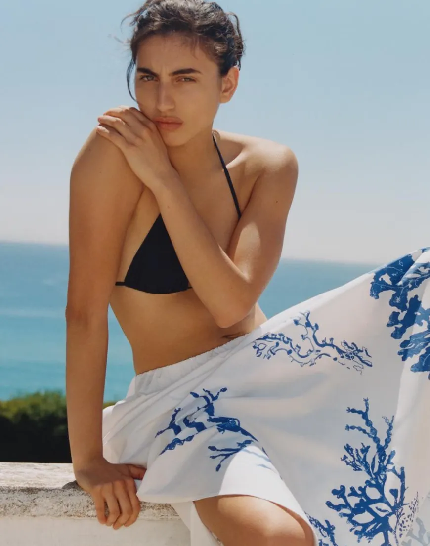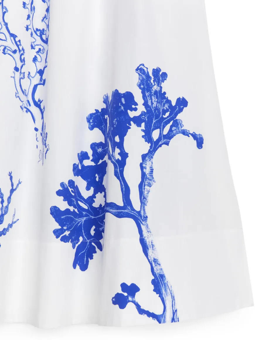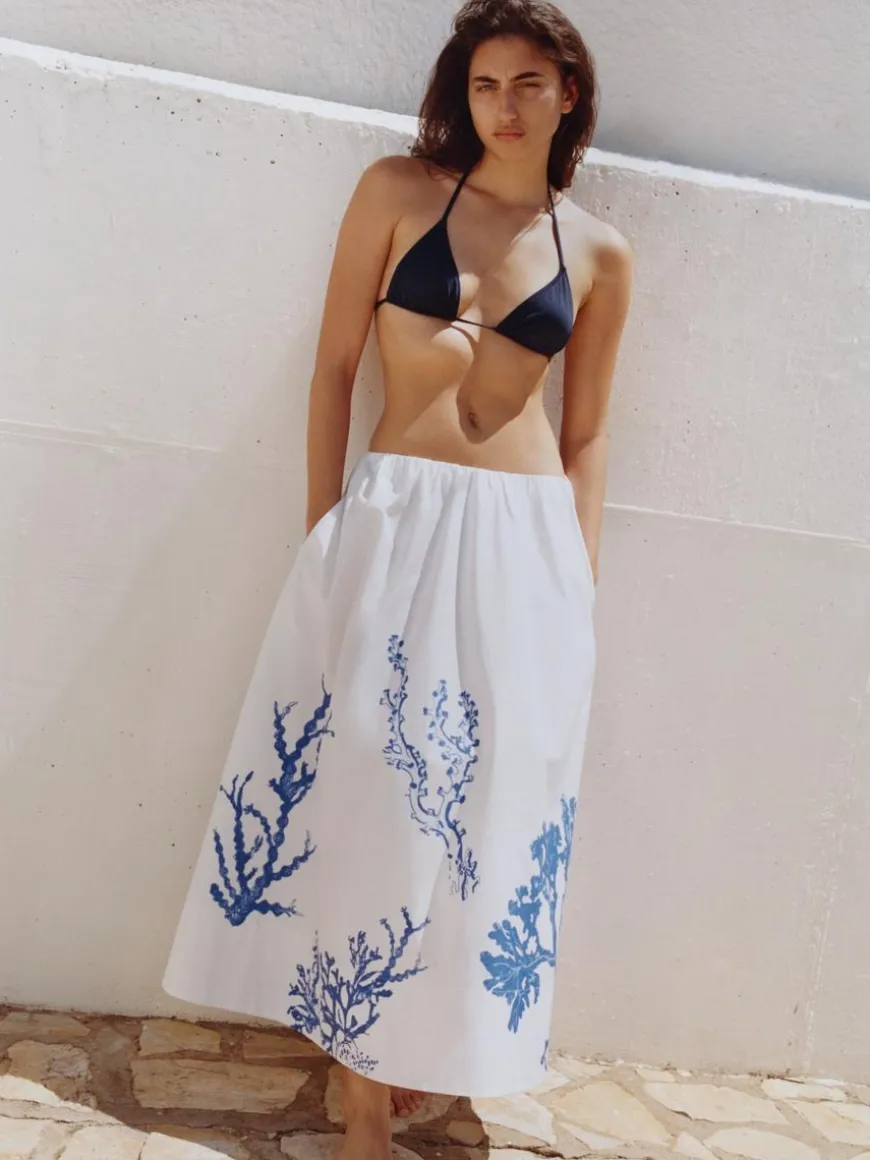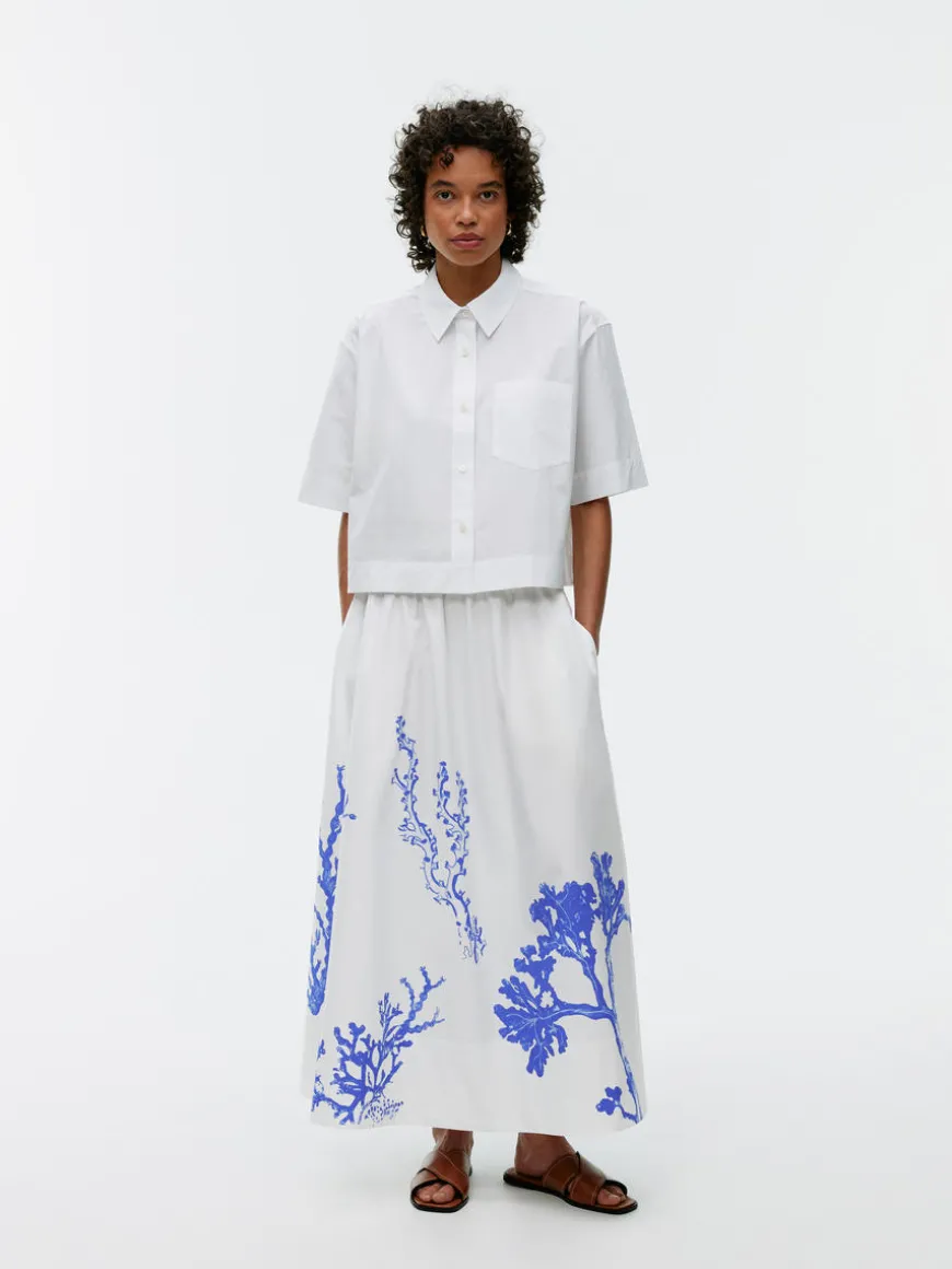 A-line midi skirt in cotton. Hidden elastics at waist and hidden side pockets. Slits at sides. Unlined.