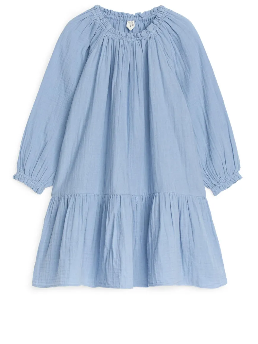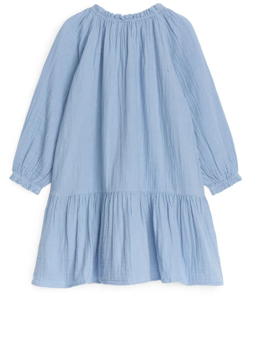 Muslin dress with frill details and elastics at neckline and cuffs. Gathers at waist and raglan, 3/4-length sleeves.