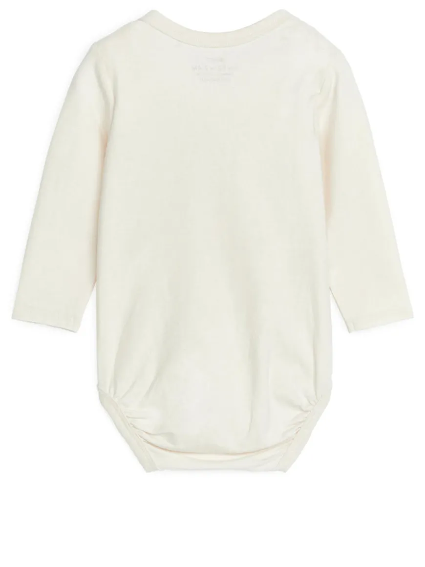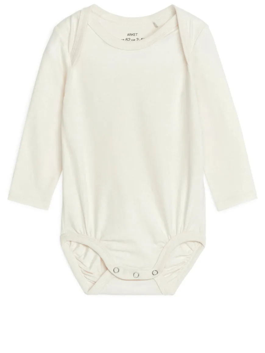 Bodysuit for the newborn baby. Crafted from an ultra soft, stretchy cotton jersey with a brushed surface for a peach-like feel. Styled with an envelope-style neckline and snap buttons in crotch for easy dressing.