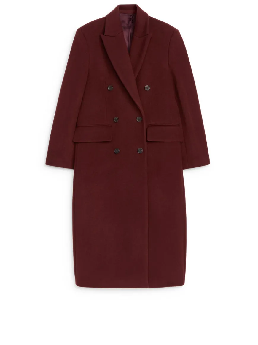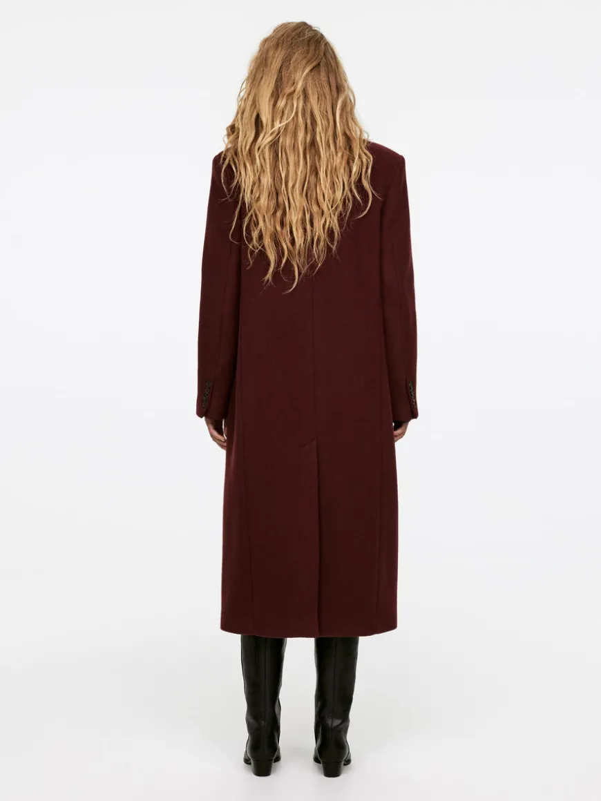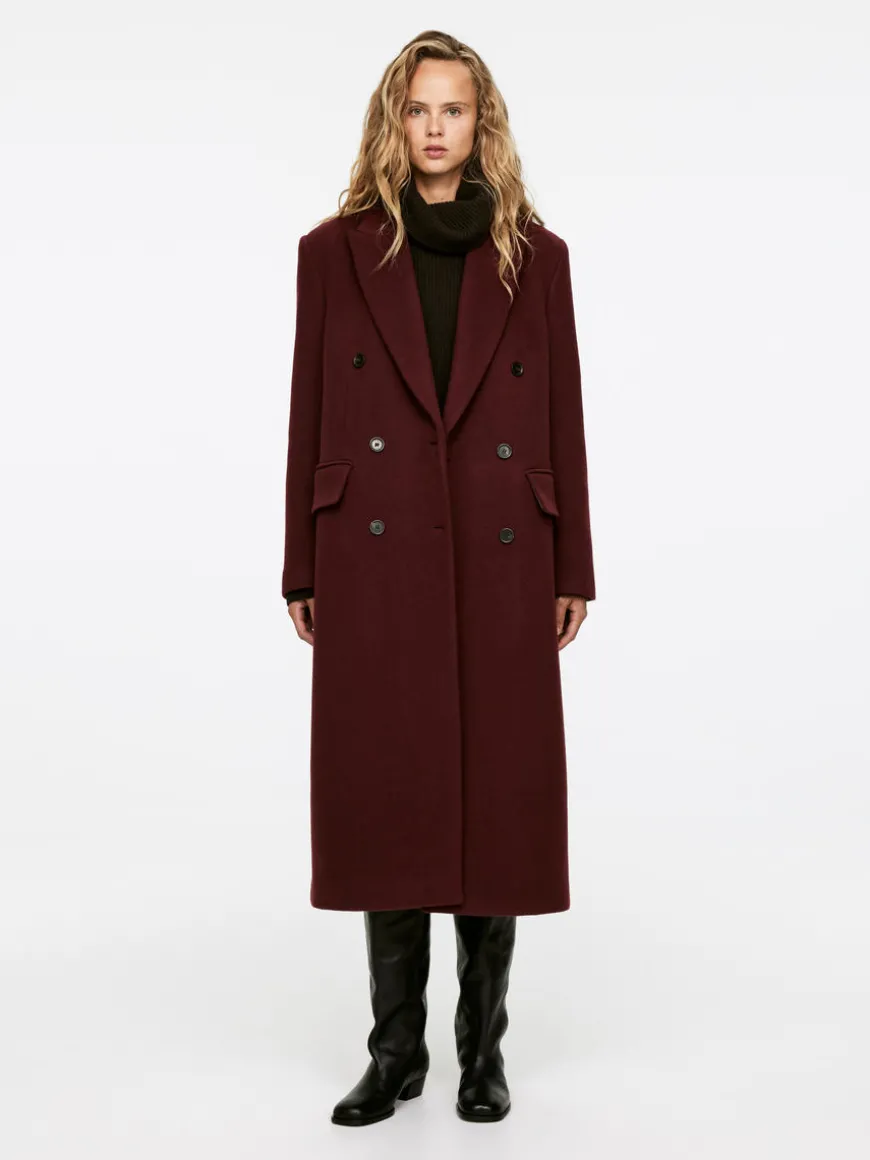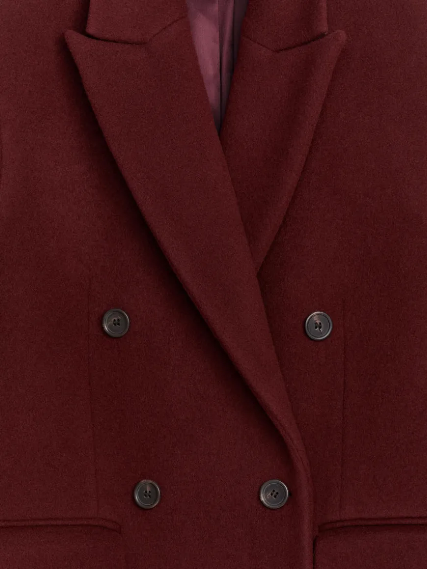 Double-breasted coat crafted from a wool-blend. Styled with an oversized fit and shoulder pads. Double welt pockets with flaps vent at back. Fully lined. Oversized fit. The shell fabric contains 75% RWS wool (TE-00047206). Products certified to the Responsible Wool Standard (RWS) contain wool fiber from farms independently certified to animal welfare and land management requirements.