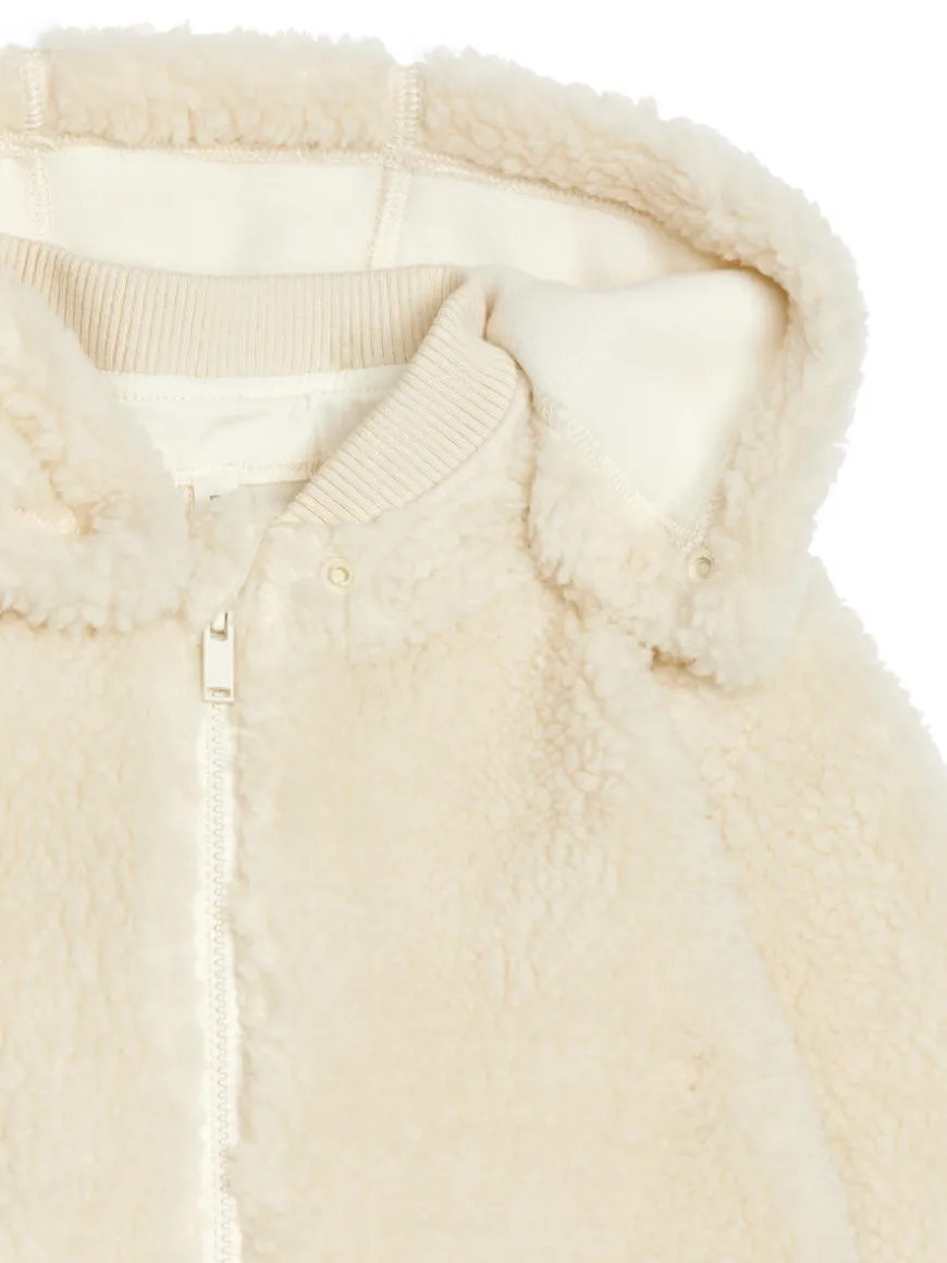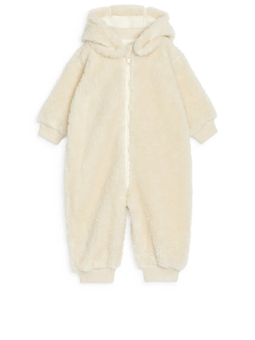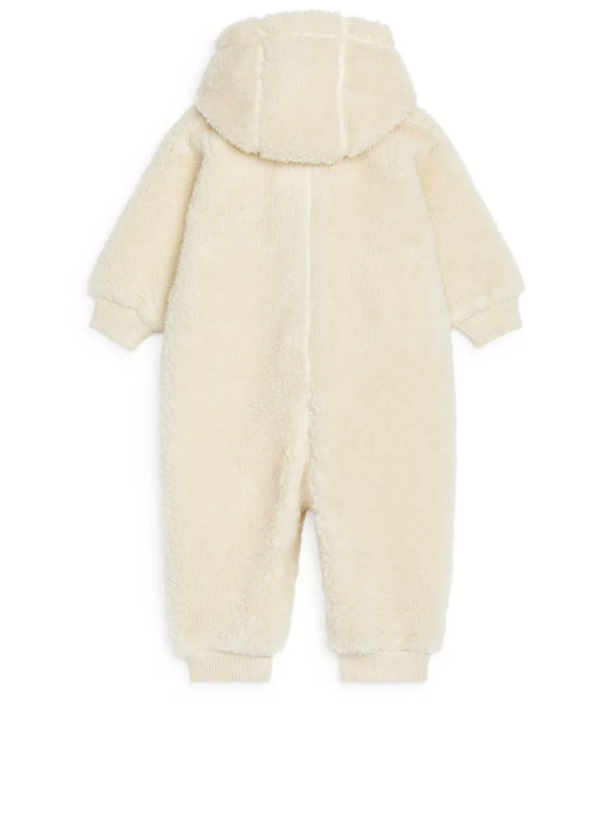 Overall made from a super soft pile fabric bonded with fleece on the inside for extra warmth and comfort. Detachable hood with snap buttons. The overall has a front zip that goes all the way down and continues to the back to enable easy dressing and changing. Ribbed cuffs made of cotton.