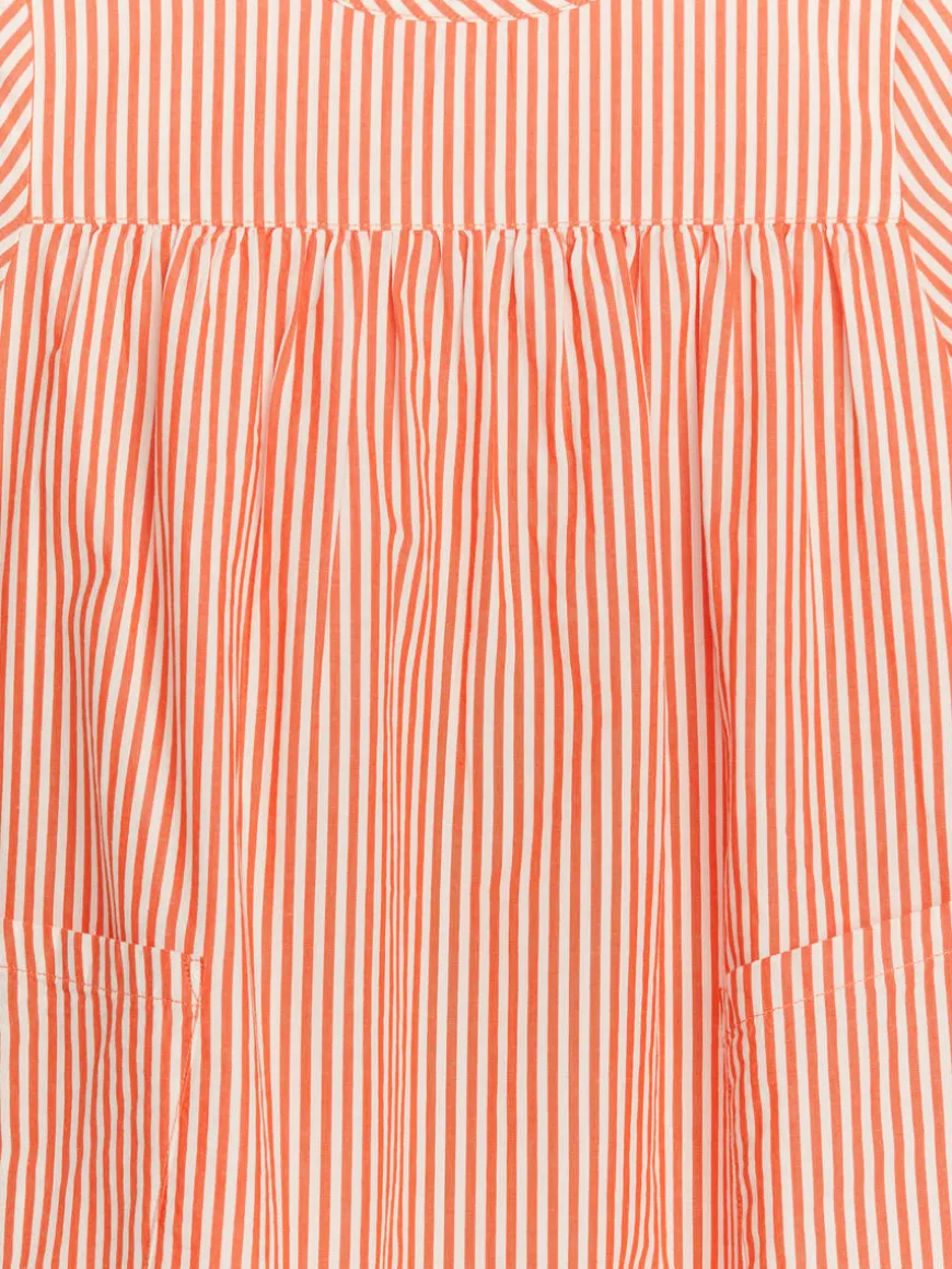 This summer dress is cut from a soft poplin fabric made of pima cotton. The short sleeves and the voluminous silhouette give this dress an airy feel, making it an ideal piece for warm temperatures. It features a yoke at the top, both at the front and at the back, with creases underneath. Detailed with two patch pockets at the front and a keyhole opening with button closure at the back of the neck. Unlined. Made from high quality pima cotton. The extra-long staple fibres of pima cotton are spun into strong and colourfast yarns that yield smooth, slightly lustrous fabrics.