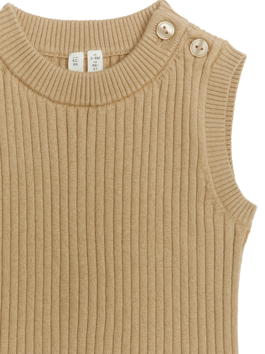 Rib-knitted vest made from a cotton and wool blend. Detailed with buttoning at shoulder.