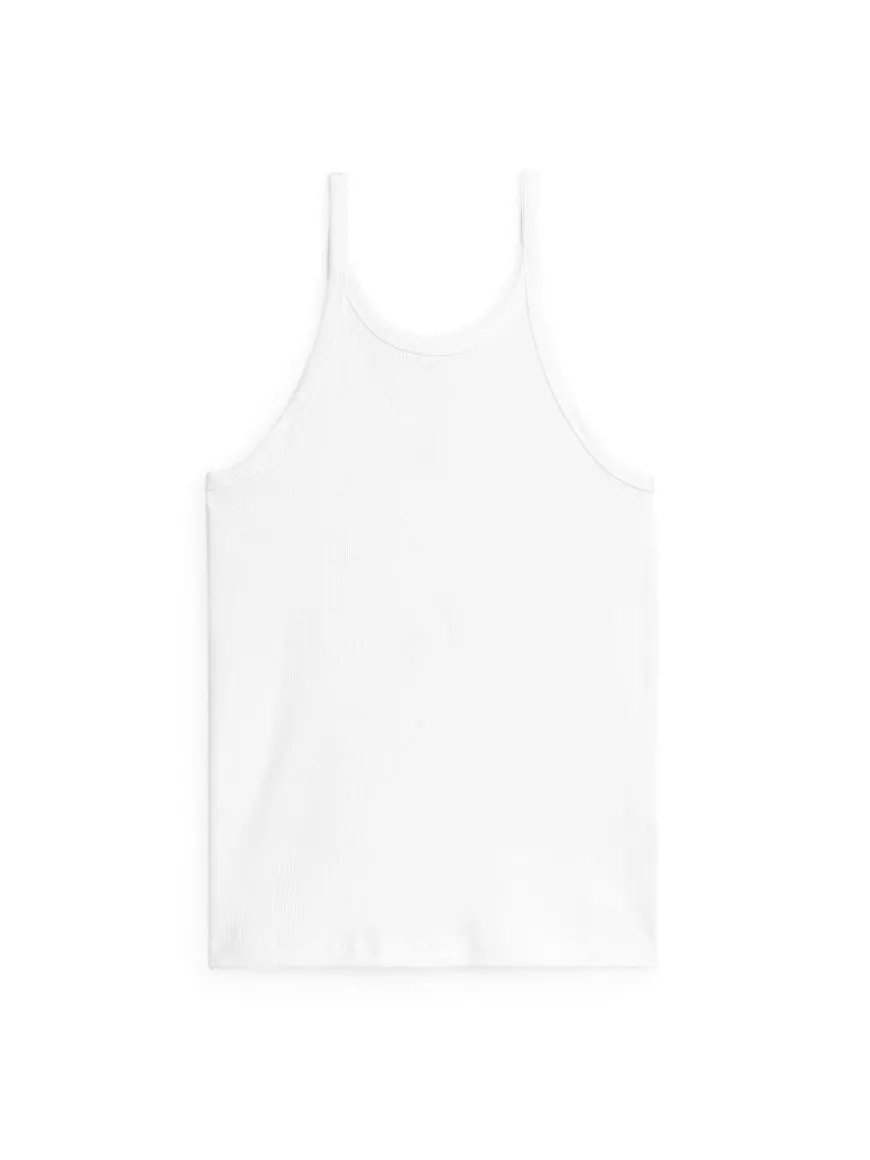 Ribbed tank top made of cotton. A slim-fit style with slender straps and a rounded neckline.