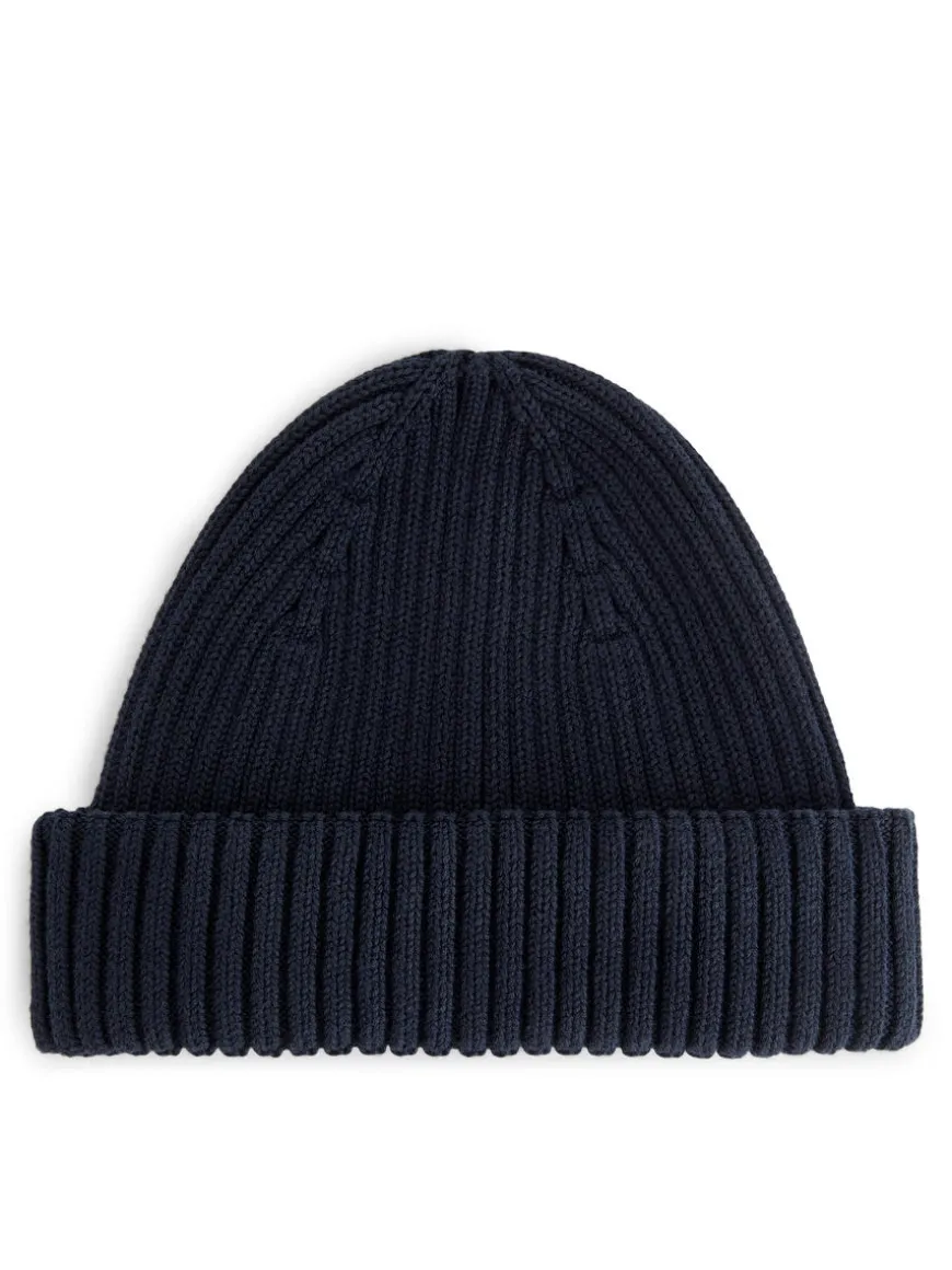 Rib-knitted cotton beanie with a fold-up brim.