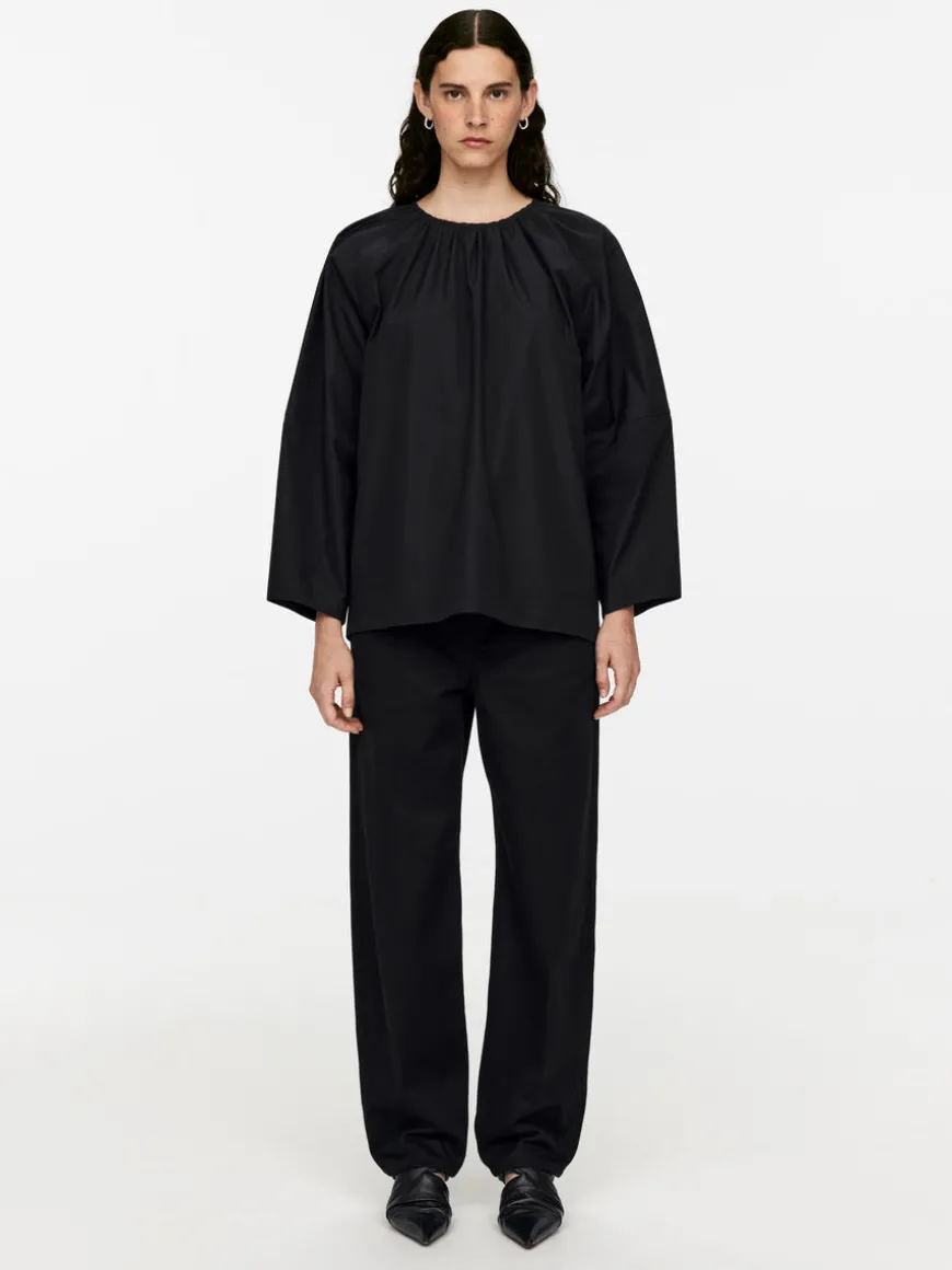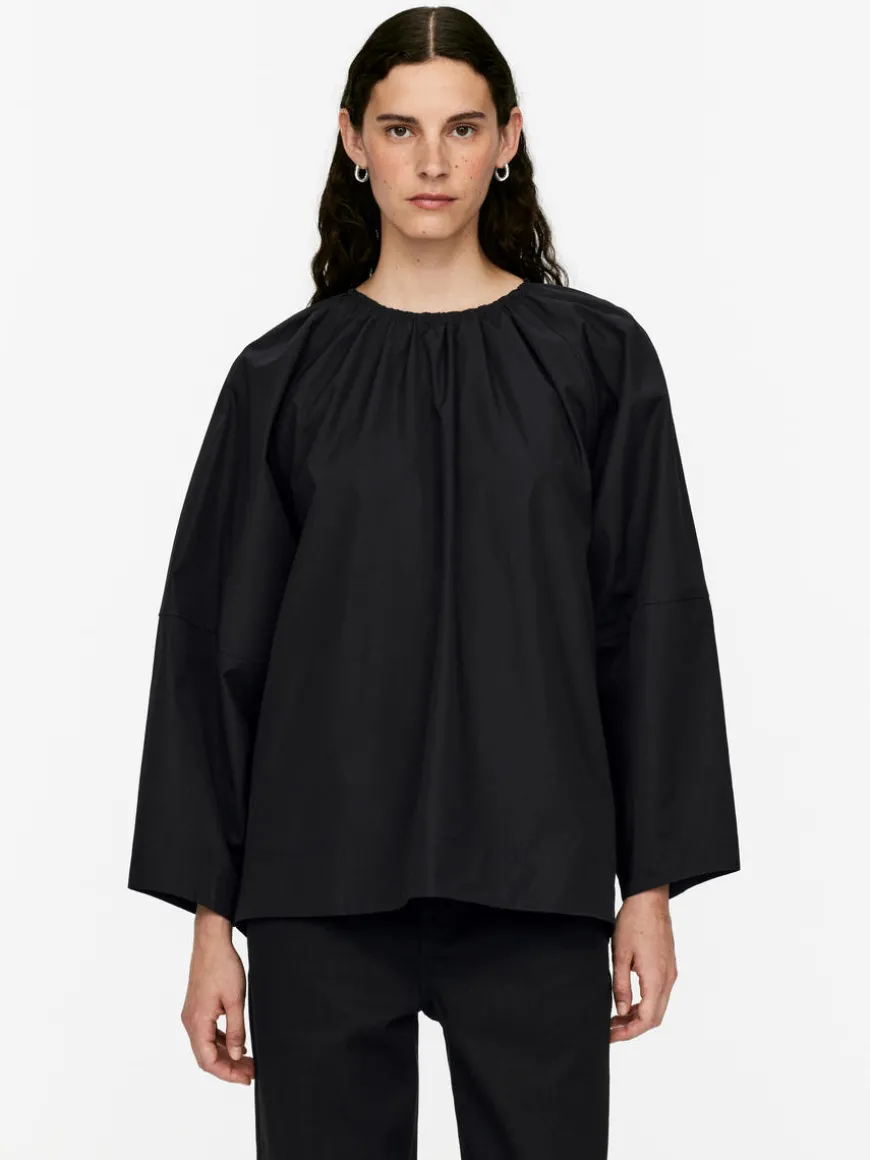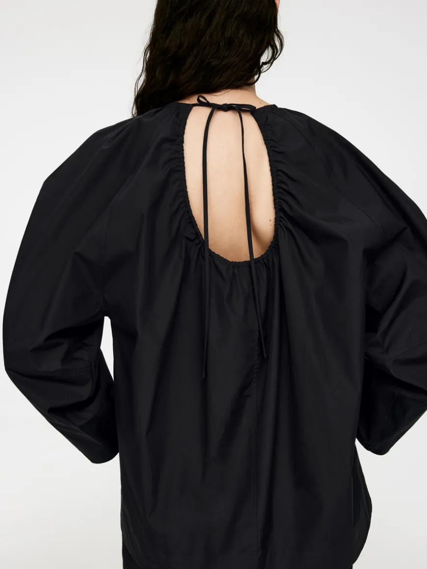 Cotton blouse styled with an open back, gathers at neck and self-ties at centre back. Loose fit.