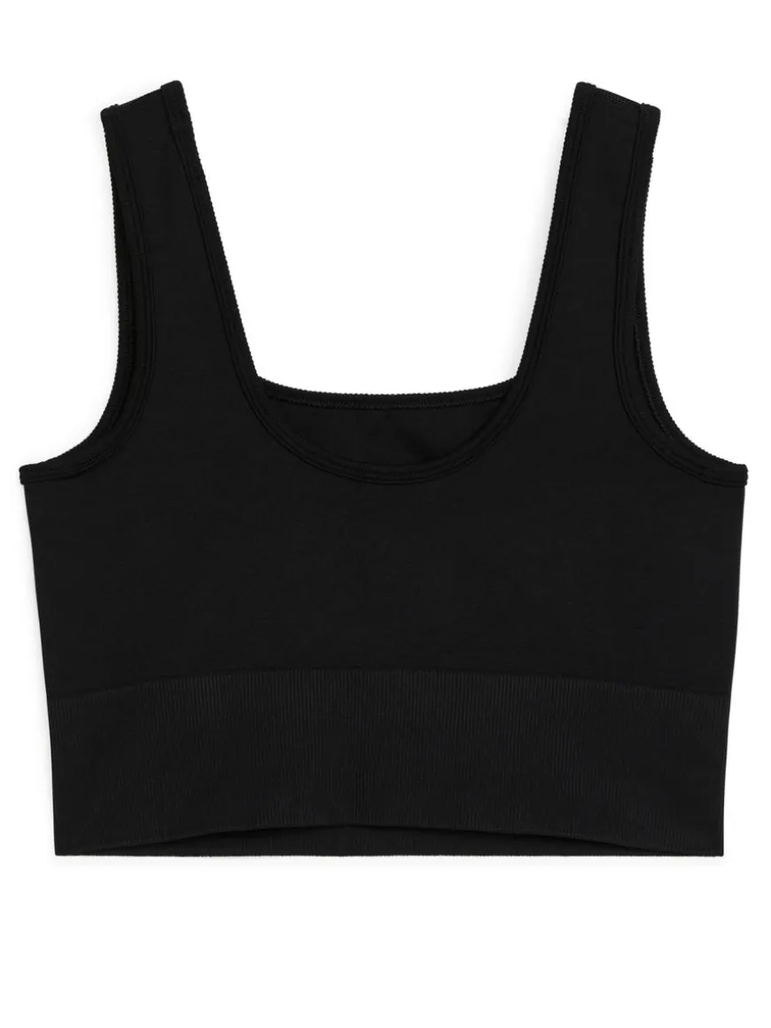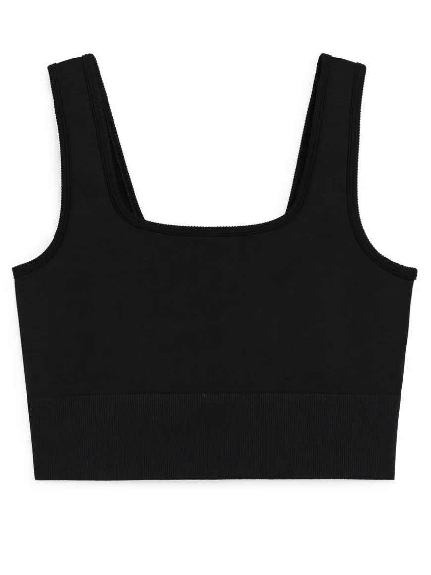 Seamless sports bra styled with a squared neck and a scooped back. Medium suppport. Quick dry.