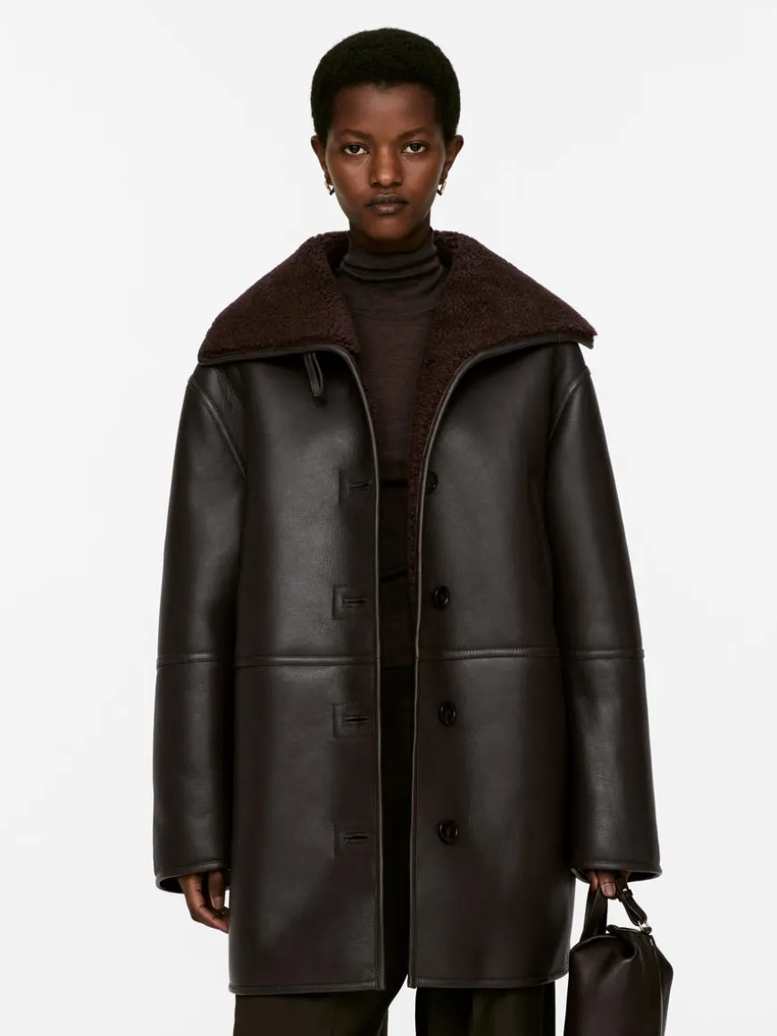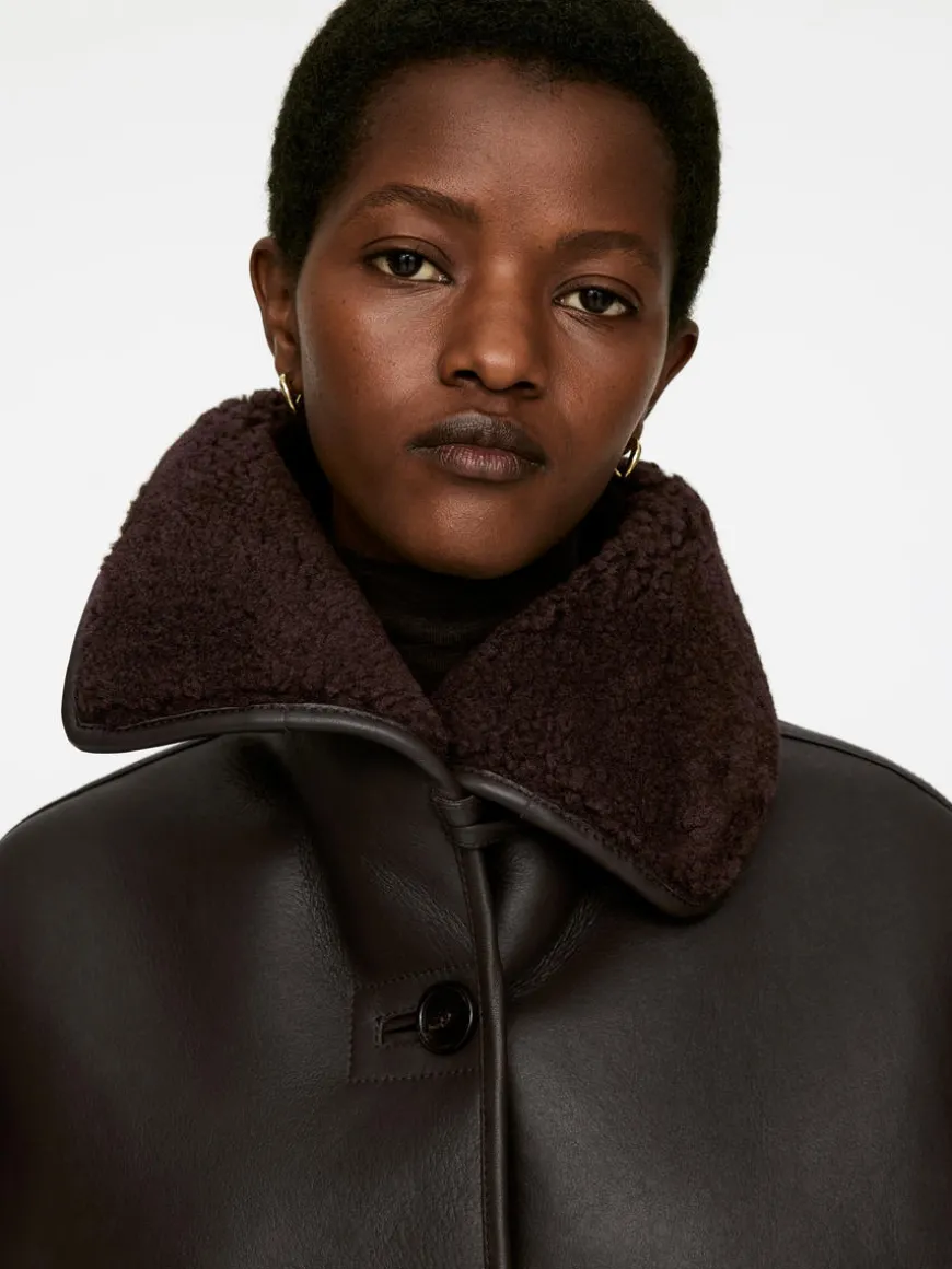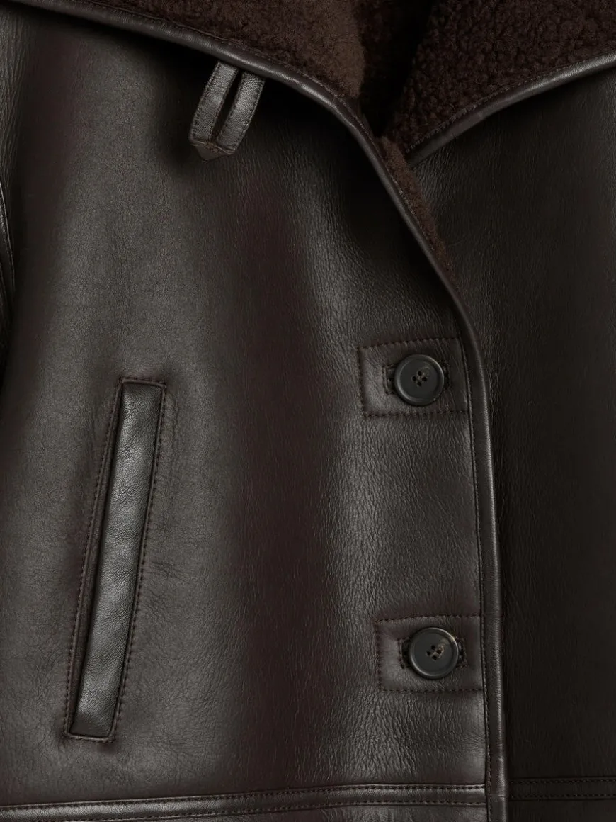 Single-breasted leather jacket with a soft shearling interior. Styled with narrow welt pockets, collar that can be folded up or down, and button closure.