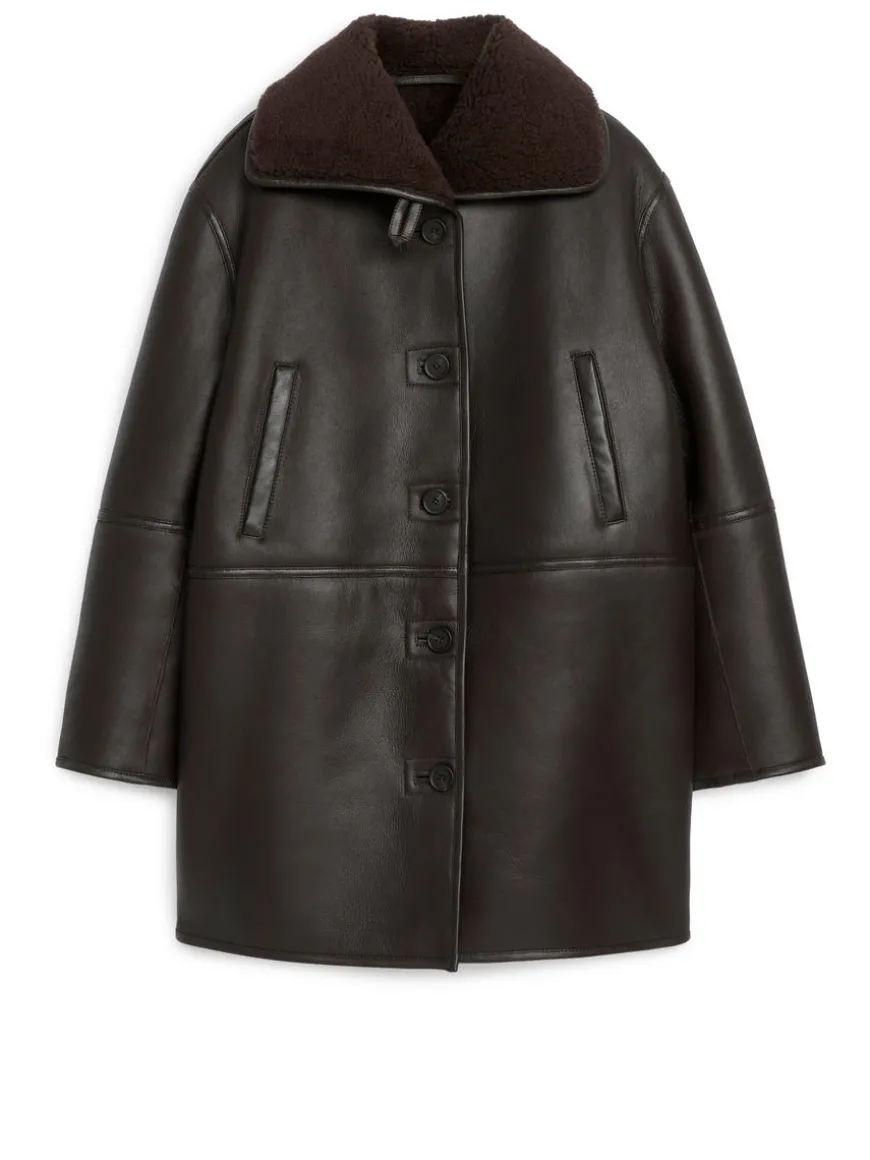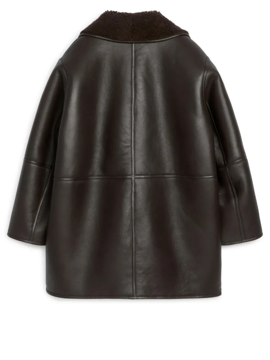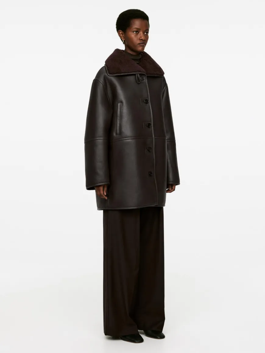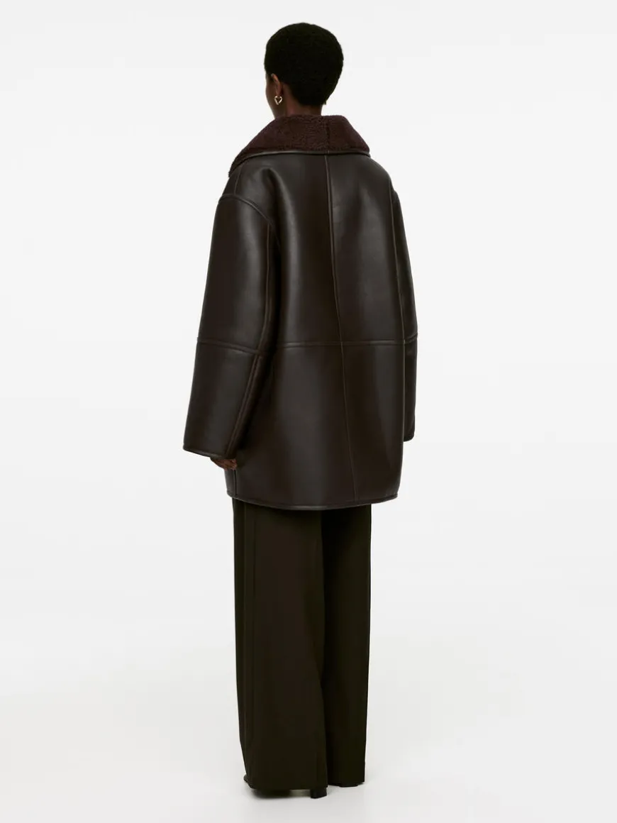 Single-breasted leather jacket with a soft shearling interior. Styled with narrow welt pockets, collar that can be folded up or down, and button closure.