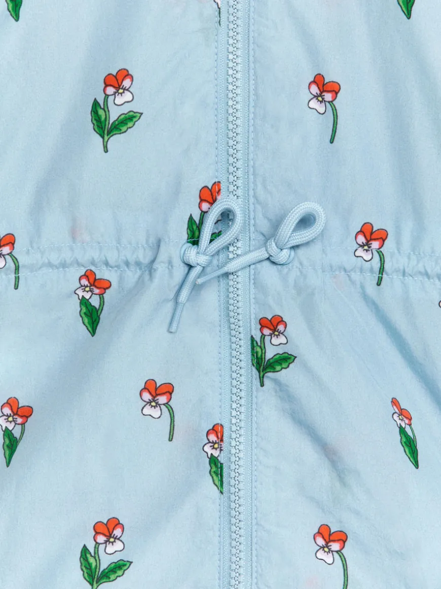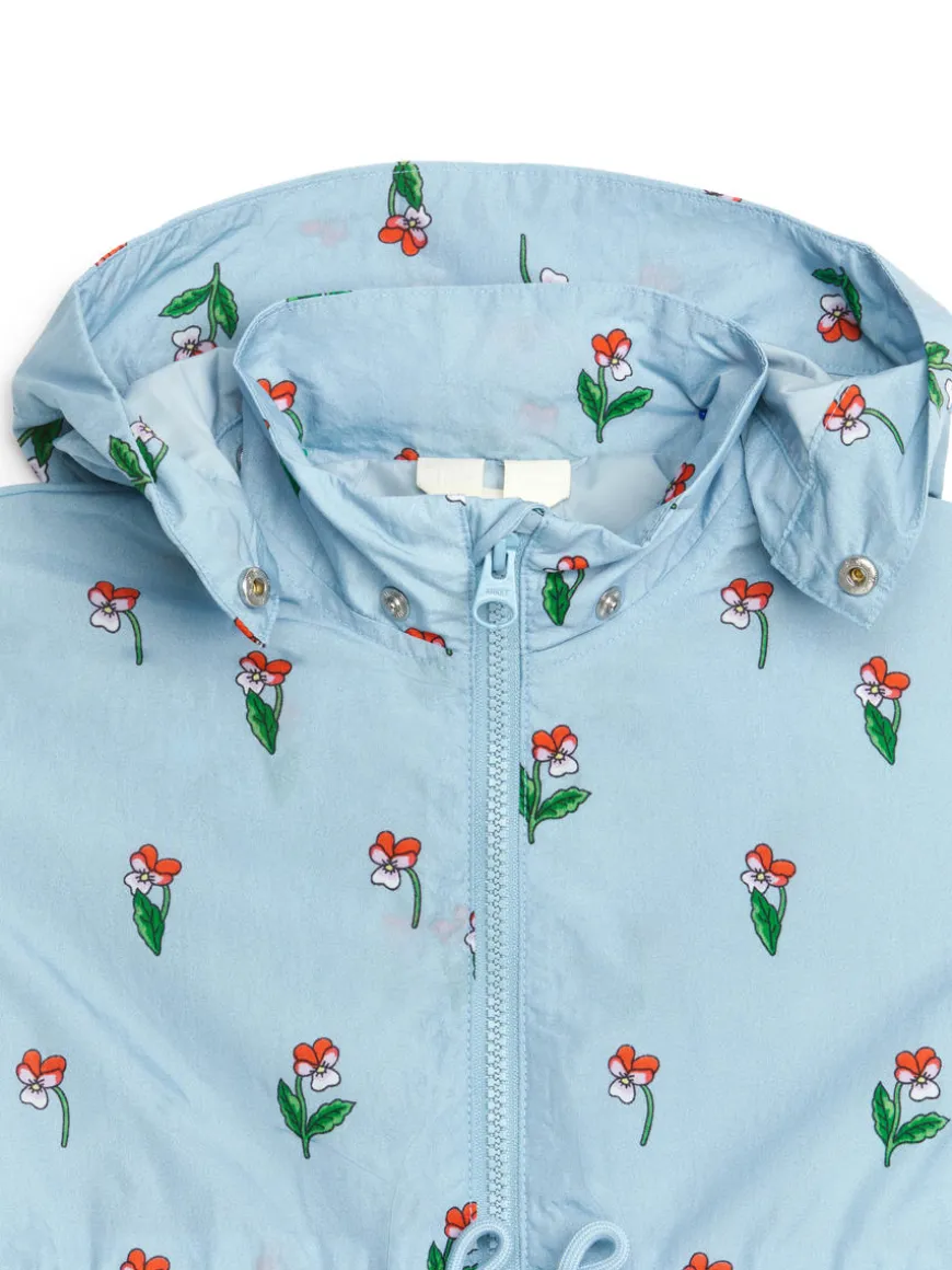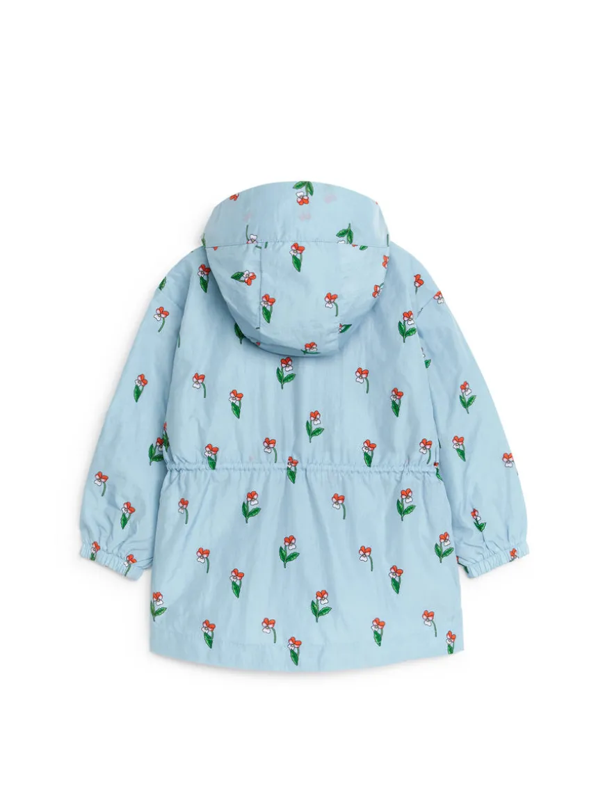 Shell jacket with an all over print. This is a lined style with a detachable hood, side seam pockets and a drawstring at waist.