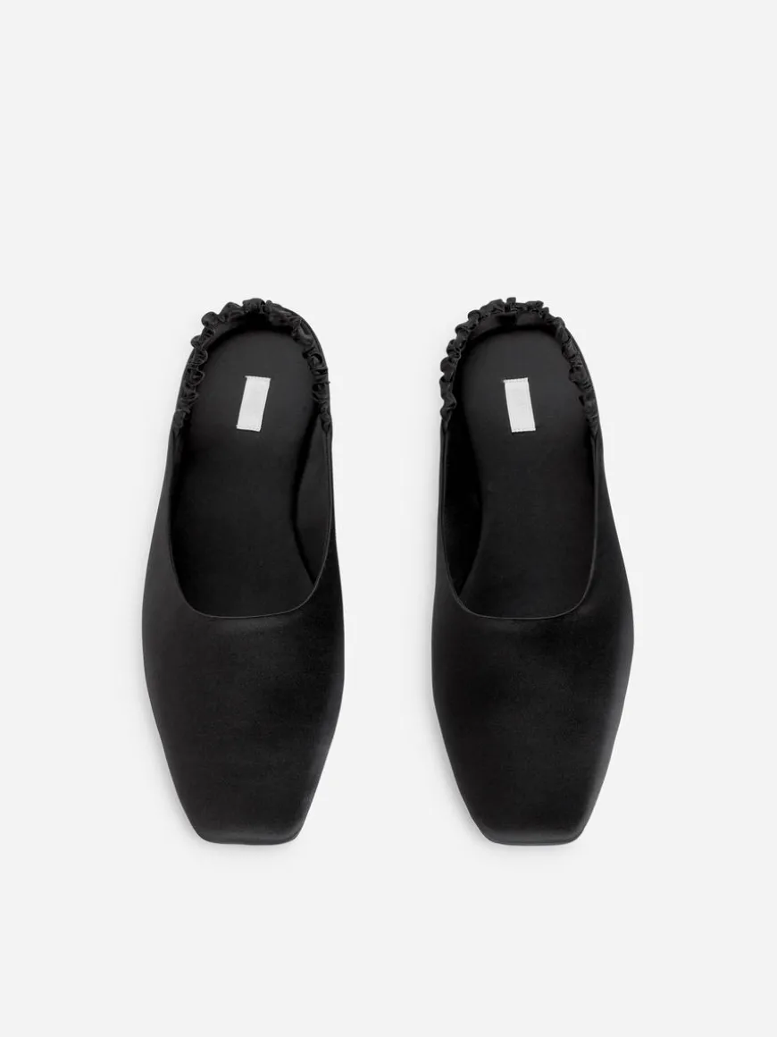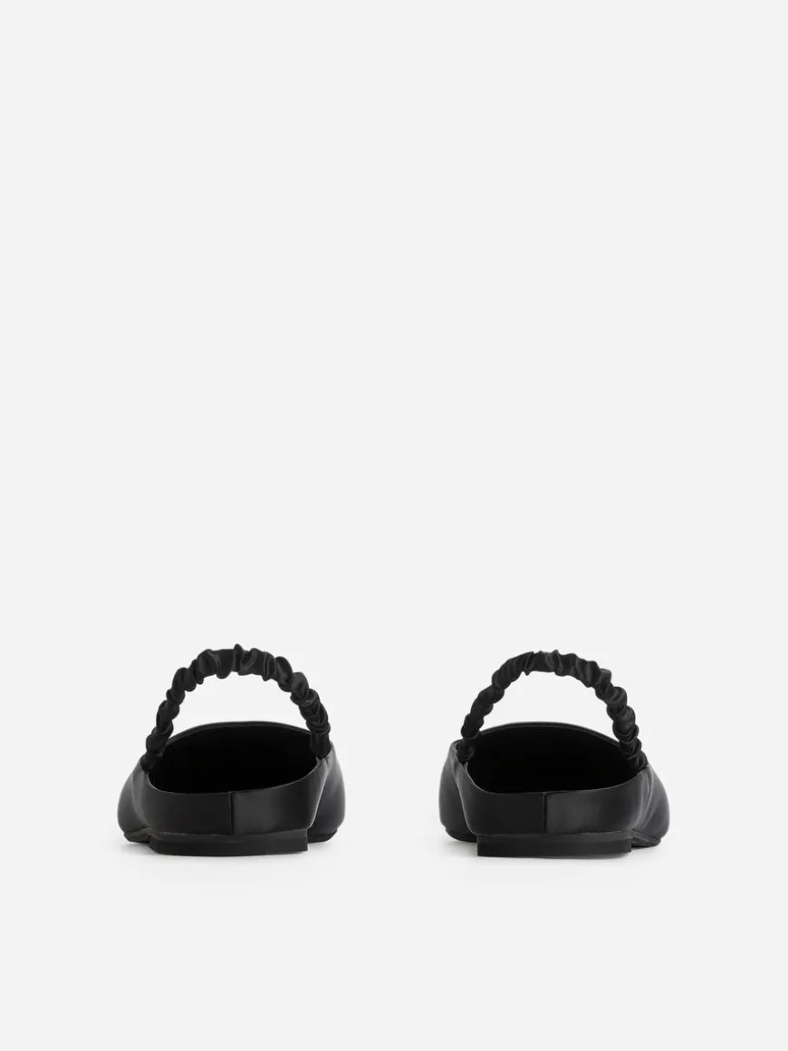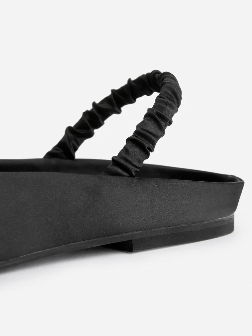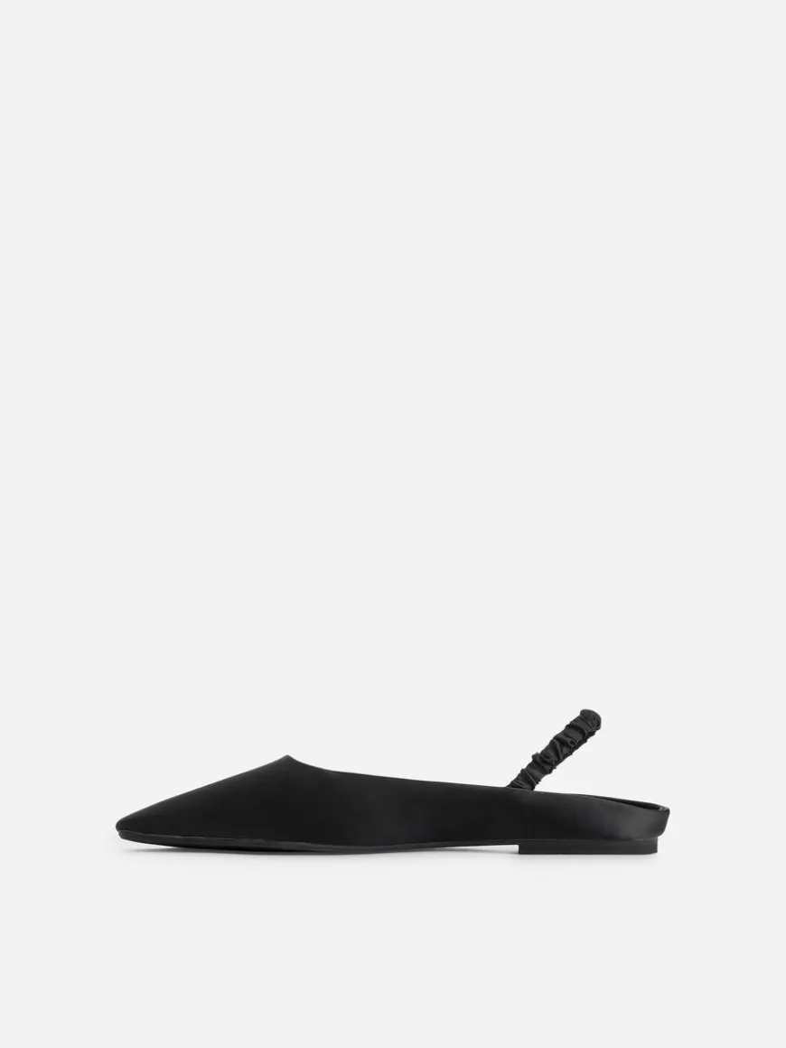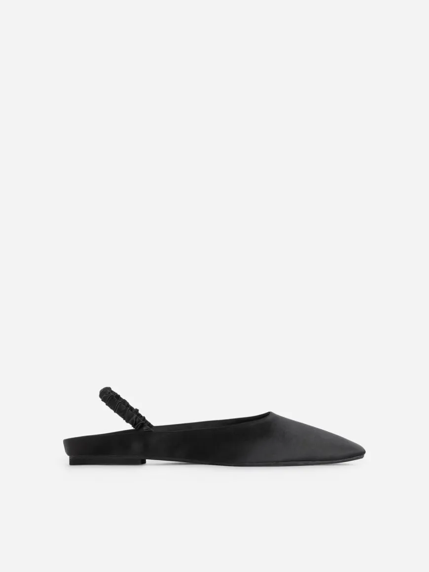 Satin indoor flats with elastic sling-back, squared toe and rounded upper. Rubber sole.