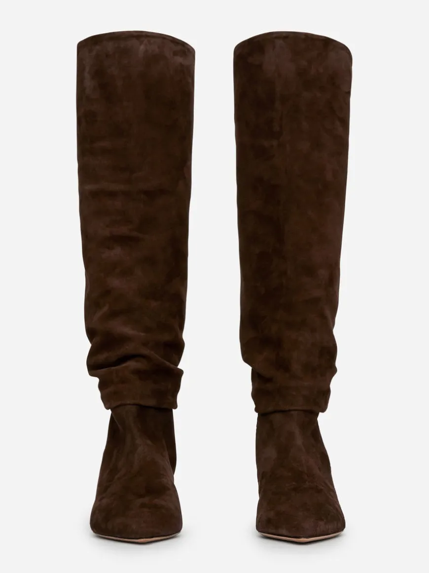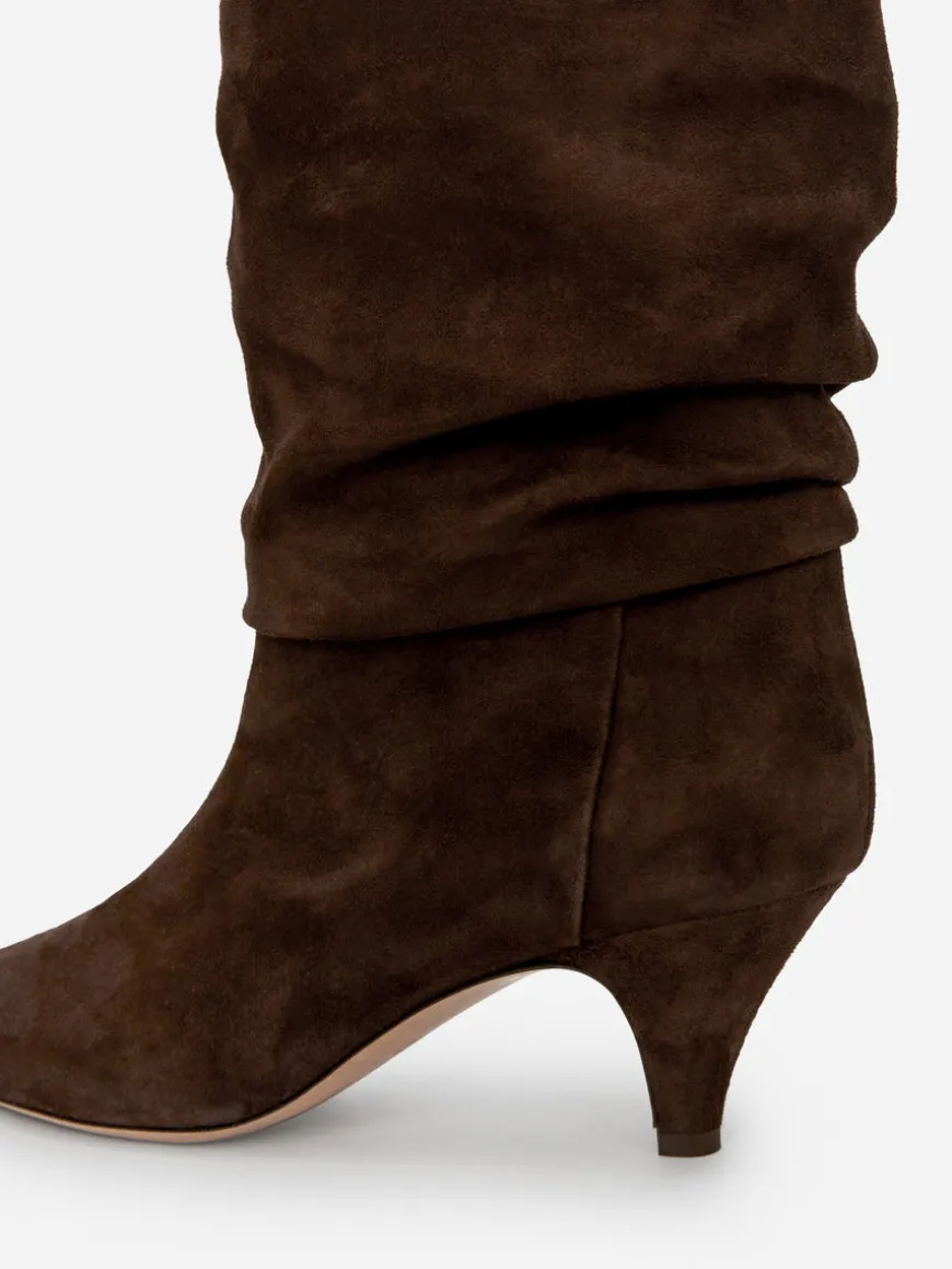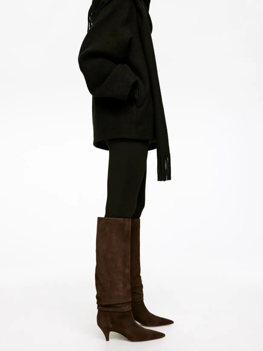 Suede boots with a slightly wider, slouchy shaft that can be worn up or down. Pointy toe and heel. Heel height 6 cm.