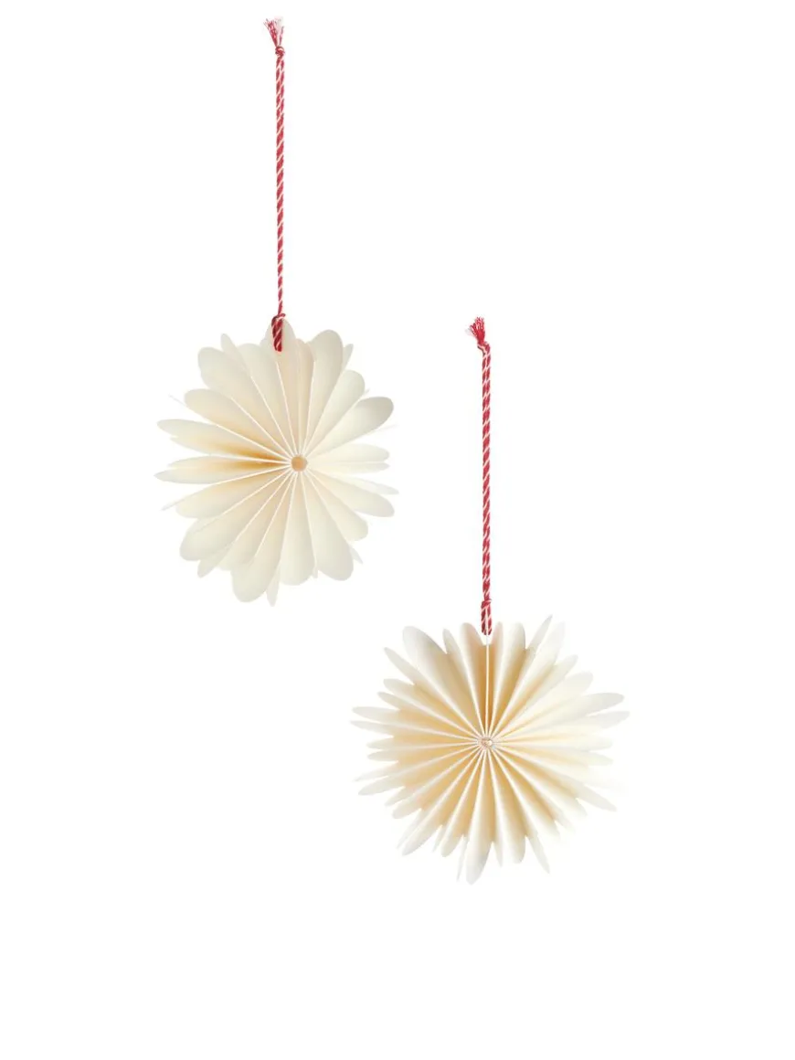 Hanging ornament in the shape of a snowflake. Handmade from sturdy paper. A cotton string attached for easy hanging. Sold in set of two. Diameter 10 cm