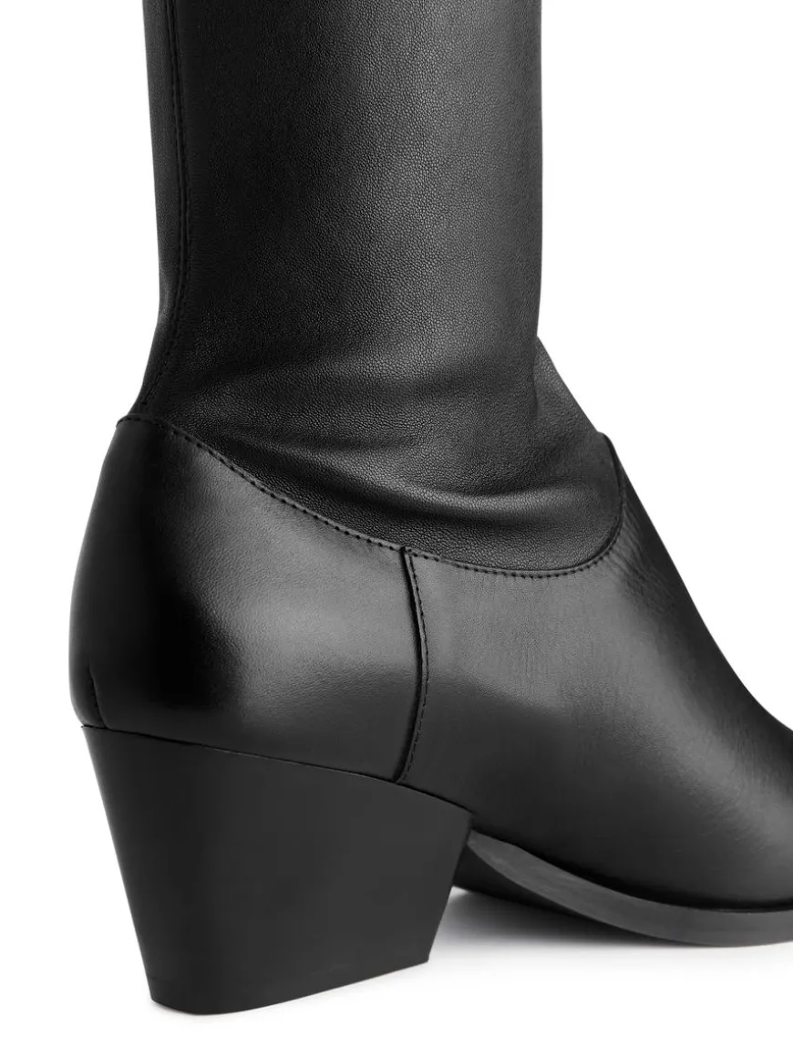 Knee-high leather boots, styled with a stretchy shaft featuring a sock-like fit. A non-zip style with pointy toe and angled heel. Both lining and sole made from leather. The leather used has undergone a chrome-free tanning process.